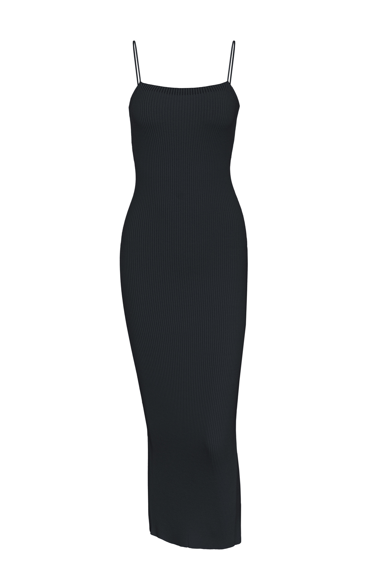 Трикотажное платье длины миди из вискозы в рубчик. Модель приталенного силуэта, на тонких бретельках и разрезом сзади.