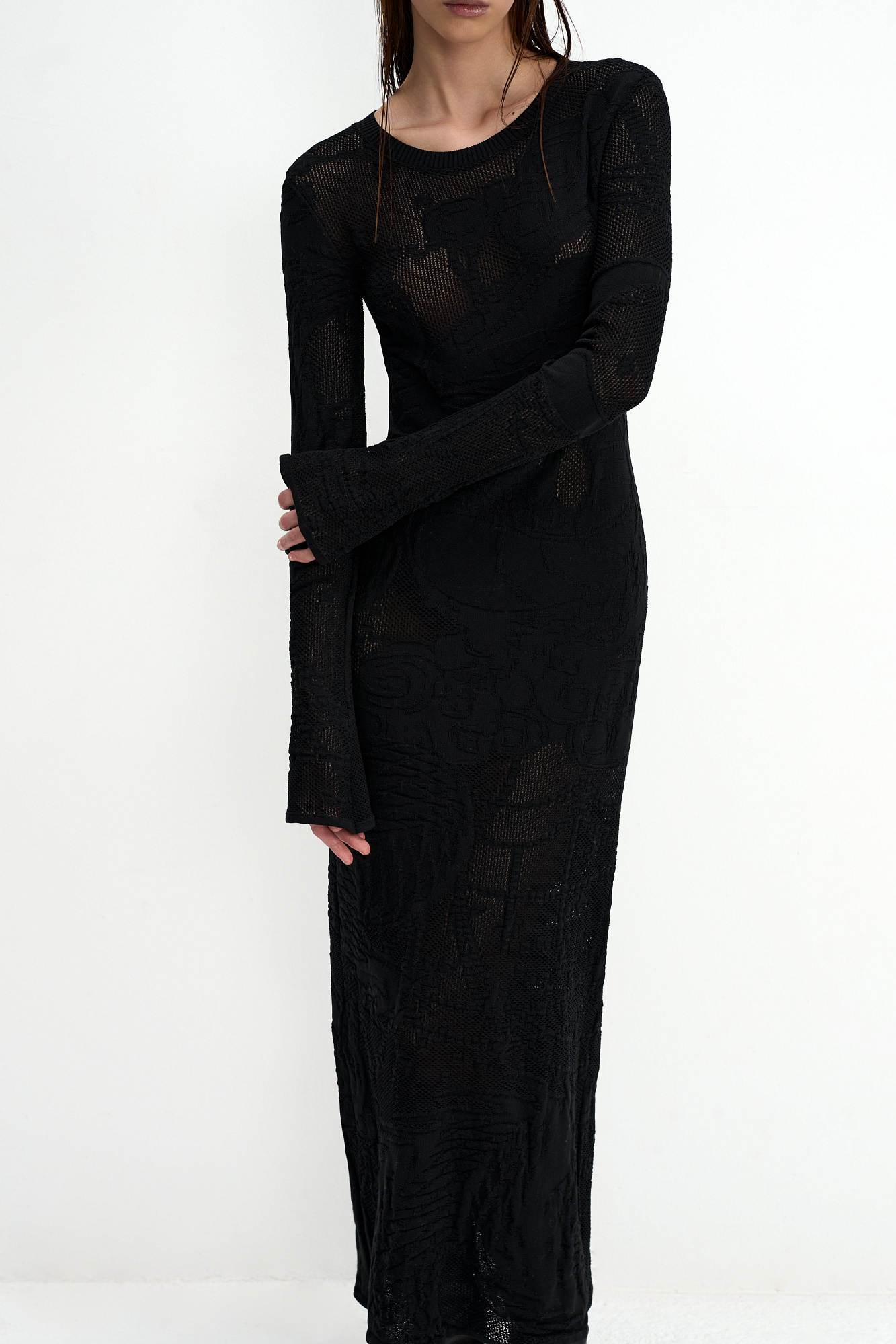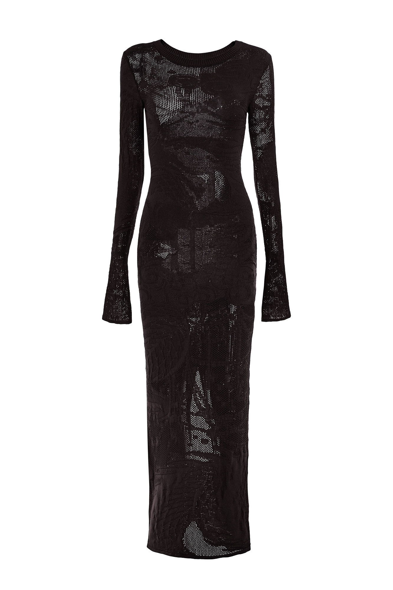 Трикотажное платье длины макси из органического хлопка. Модель приталенного силуэта, с длинными рукавами, круглым вырезом горловины и разрезом сзади. Изделие декорировано жаккардовым рисунком в виде дракона.
