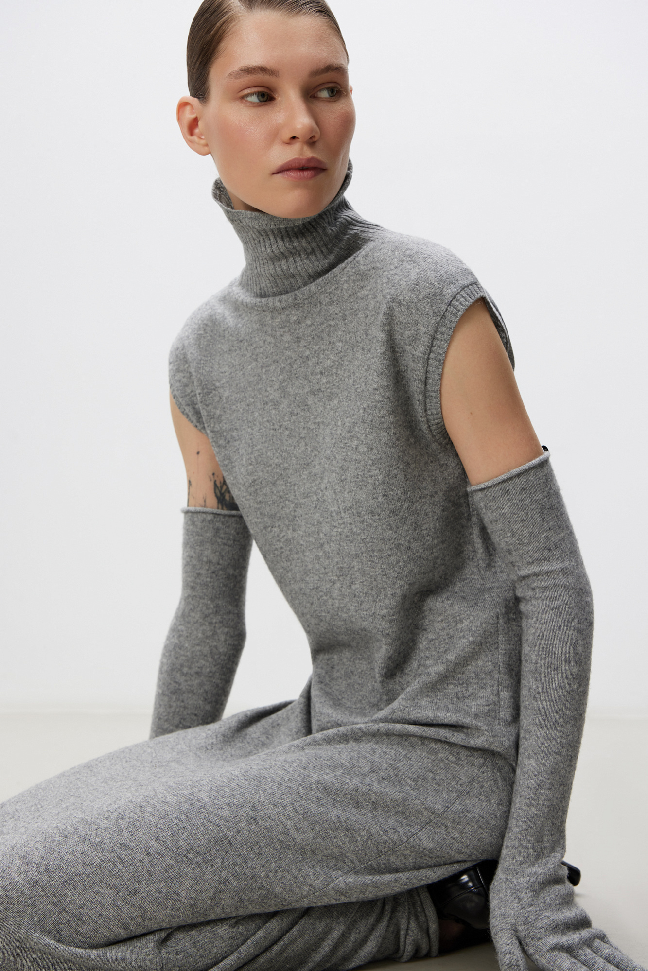 Трикотажное платье длины макси из шерсти и кашемира. Модель прямого кроя без рукавов и высоким воротником.