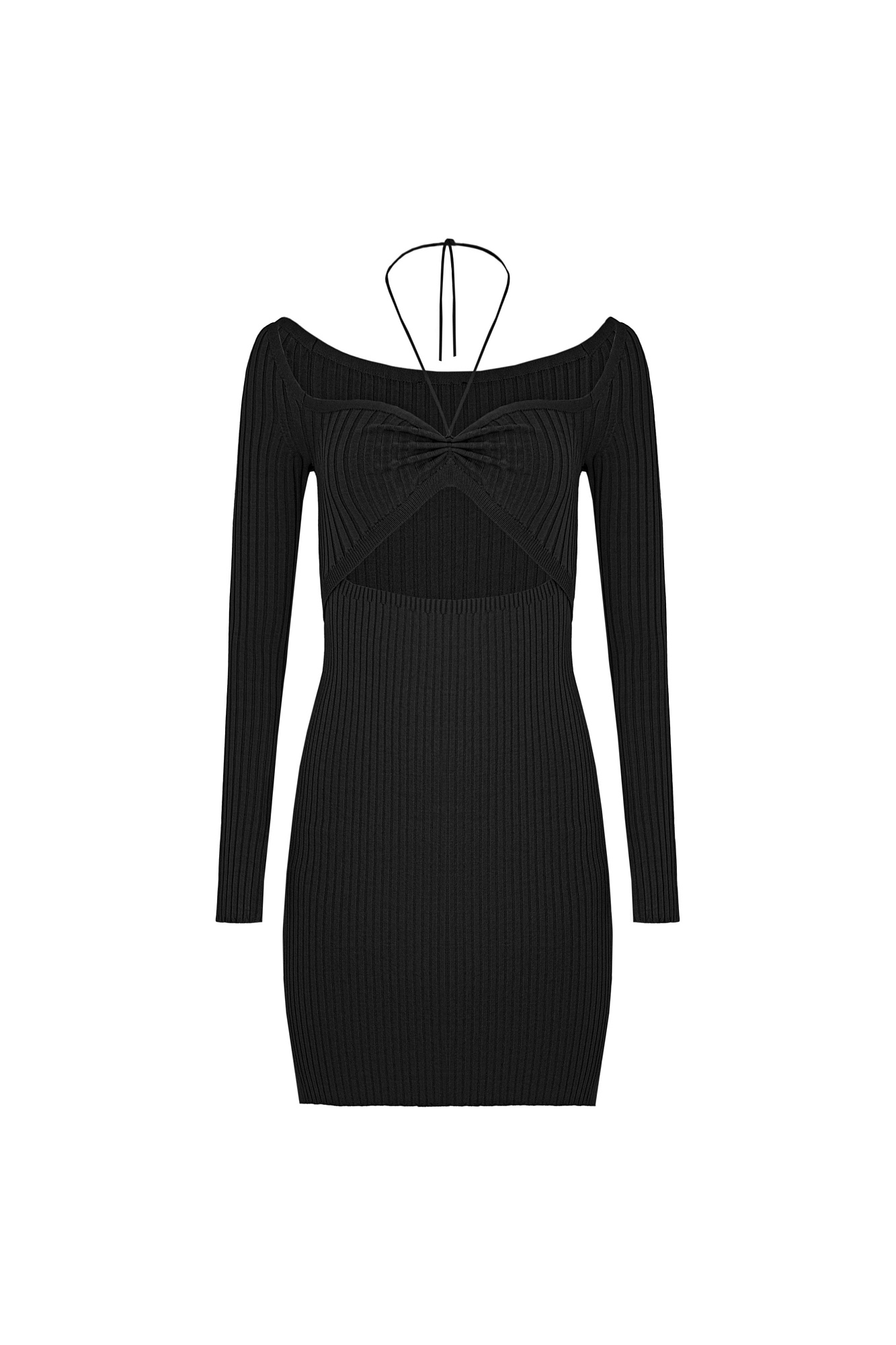 Платье длины мини из вискозы в широкий рубчик. Модель с длинными рукавами, разрезами на манжетах и глубоким вырезом декольте на кулиске, которую можно зафиксировать на шее.