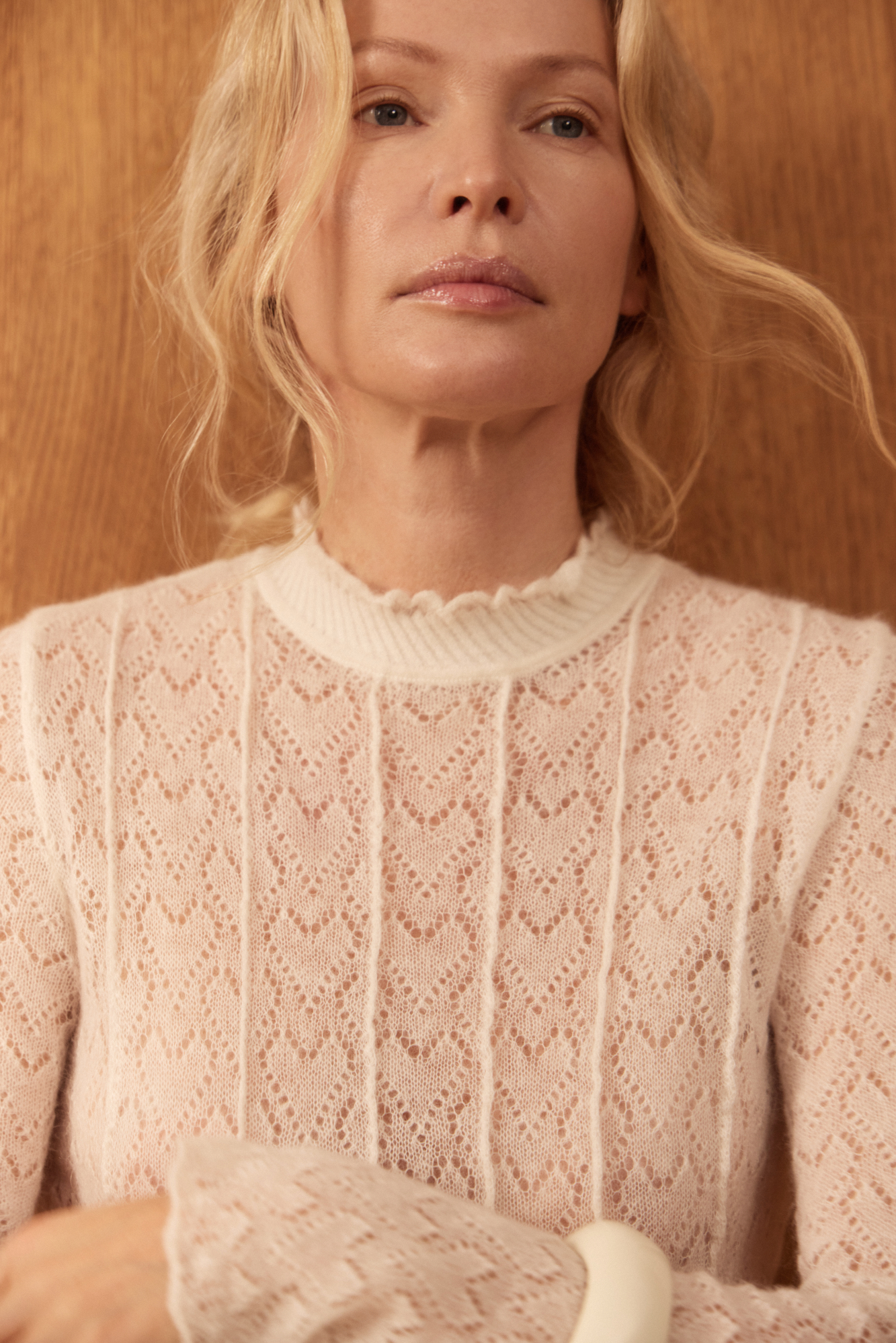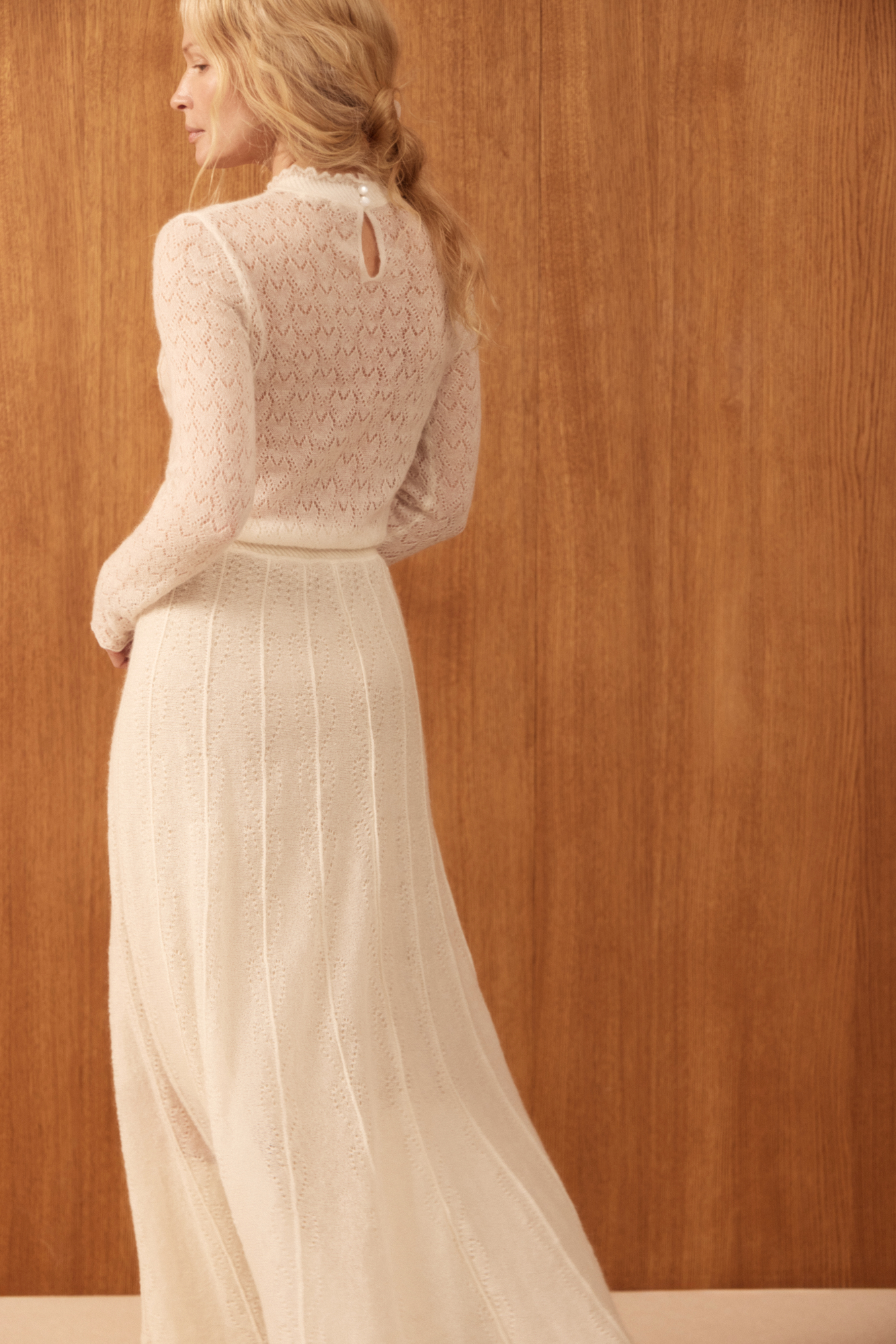 Трикотажное платье длины миди из полупрозрачного кружева с подъюбником из смесовой шерсти. Модель с длинными рукавами, невысоким воротником со сборкой и эластичным поясом. Застежка на пуговицу сзади. Платье выполнено из мягкой пряжи кид мохера и беби альпака, что позволит чувствовать себя в нем комфортно и тепло.