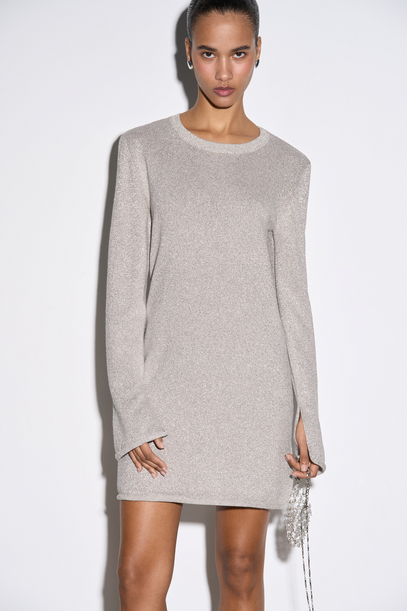 Трикотажное платье длины мини из вискозы с добавлением люрекса. Модель свободного силуэта с круглой горловиной и длинными рукавами. Края изделия декорированы валиком.