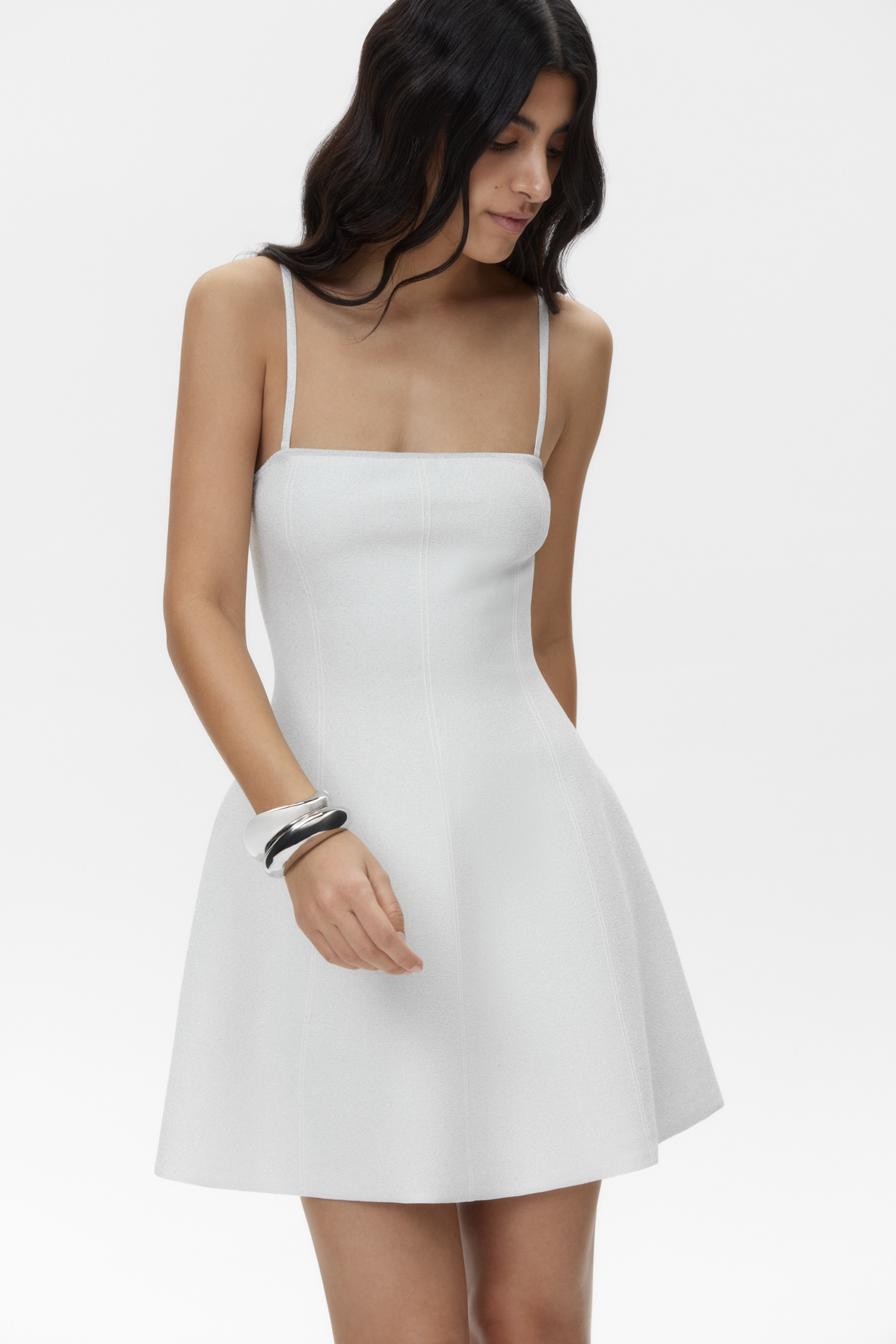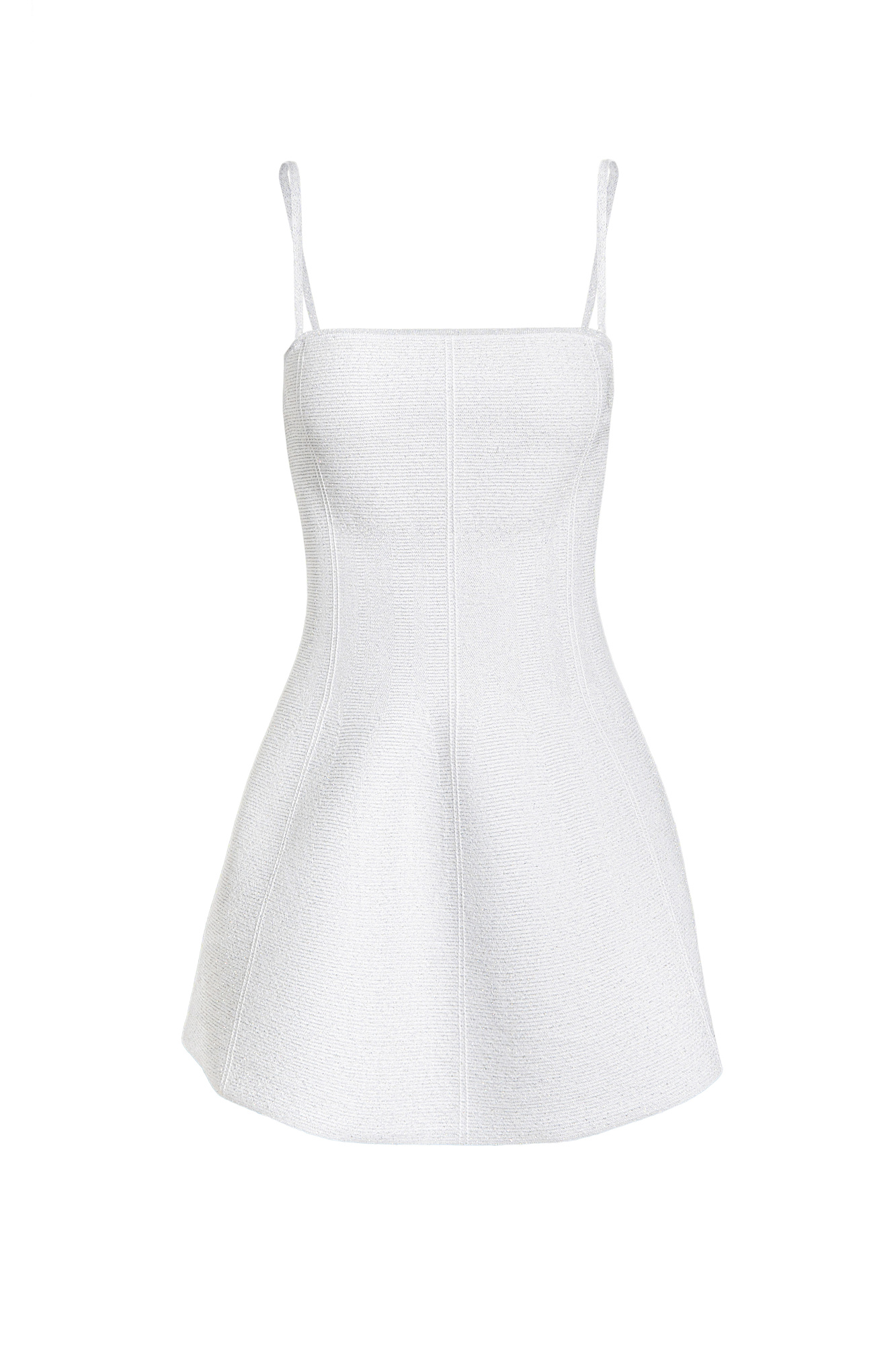 Трикотажное платье длины мини с люрексом. Модель приталенного силуэта на бретелях. Бретели снимаются. Застежка на молнию.