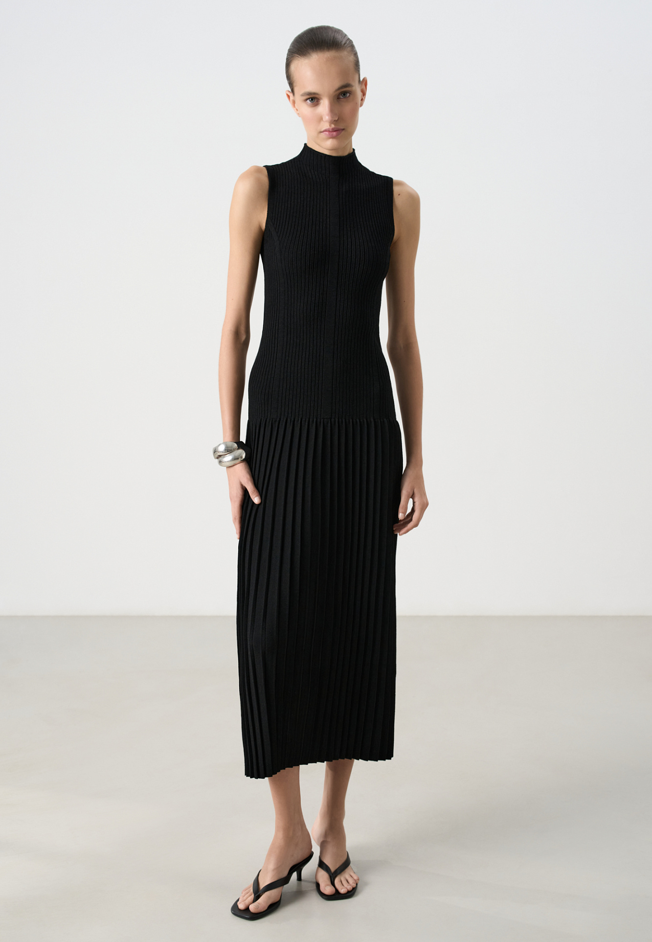 Трикотажное платье длины макси из вискозы. Модель приталенного силуэта, без рукавов, с невысоким воротником-стойкой и юбкой плиссе от бедер.
