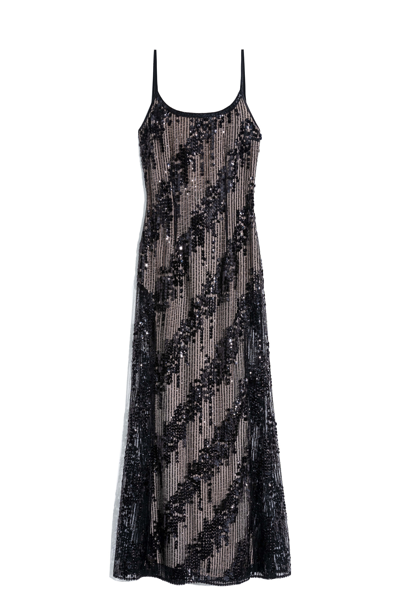 Платье с пайетками на тонких бретелях. Модель приталенного силуэта длины миди с вырезом на спине и застежкой на молнию.