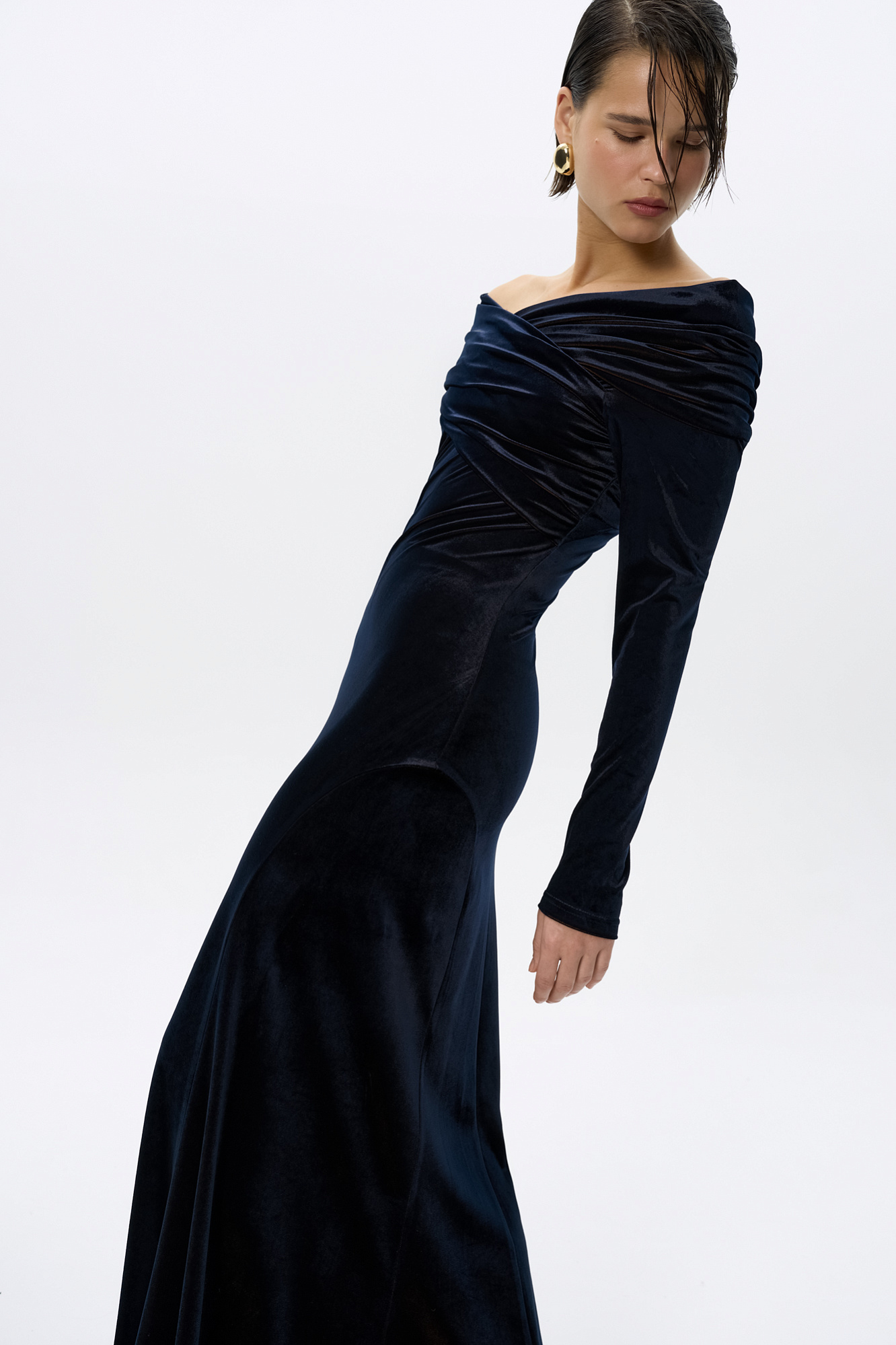 Платье из велюра длины макси. Модель приталенного силуэта с открытой линией плеч и длинными рукавами. Изделие декорировано драпировкой. Благодаря необычной текстуре ткани достигается эффект перелива цвета.