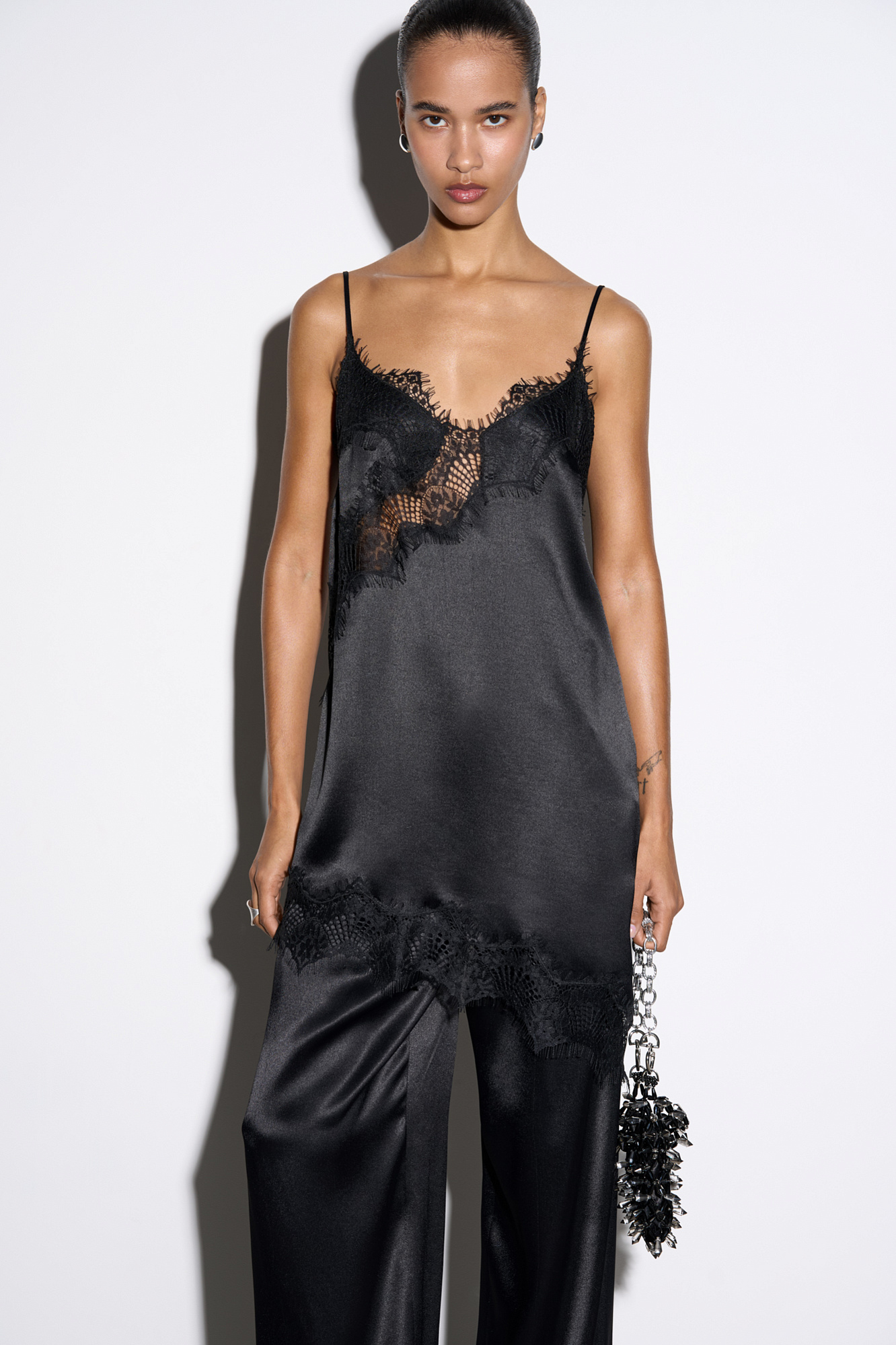 Платье-комбинация длины мини из 100% вискозы. Модель на тонких бретельках. Подол и лиф изделия декорированы тонким кружевом контрастного цвета.