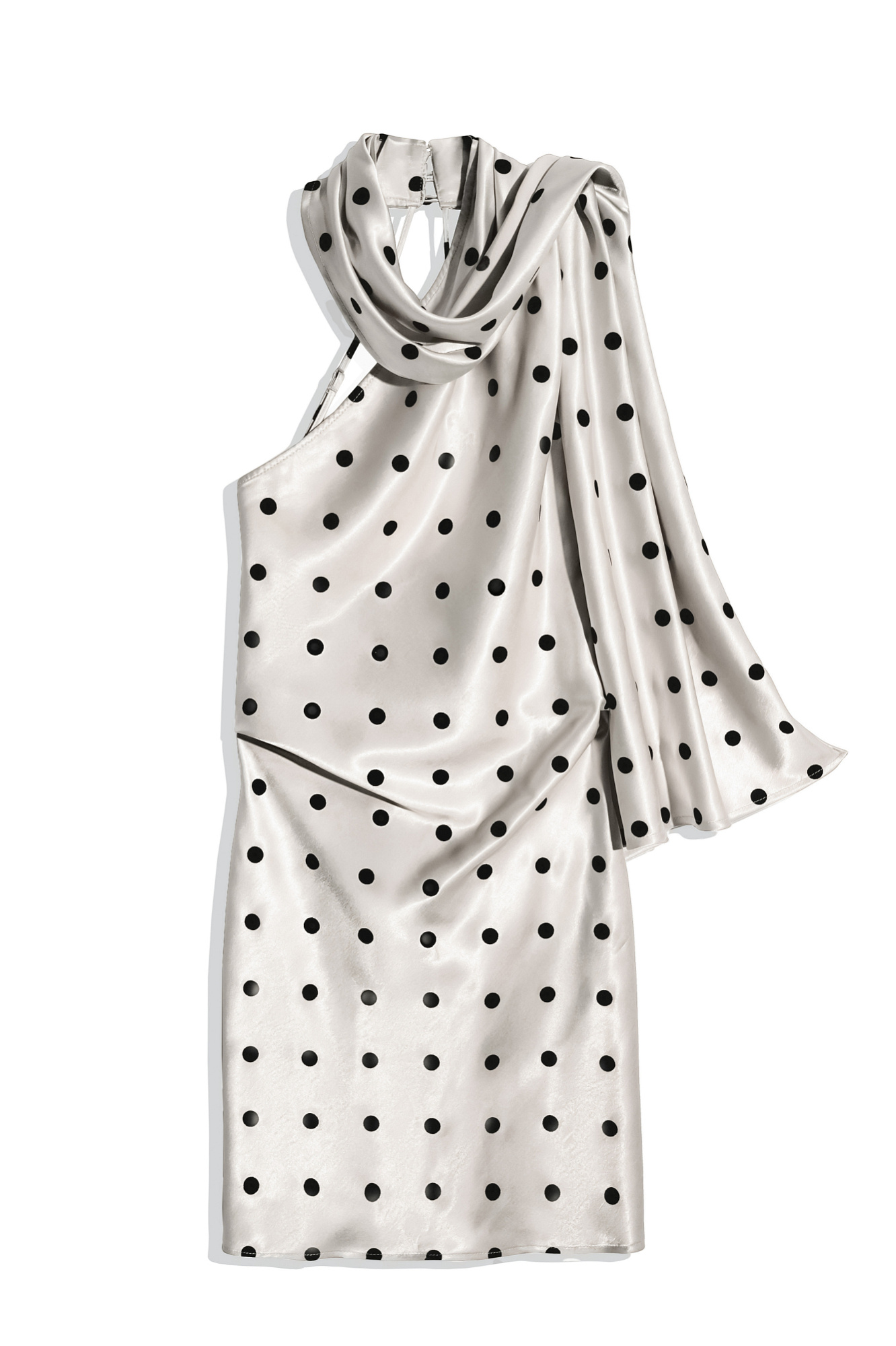 Атласное платье длины мини с принтом в горох. Модель по фигуре с вырезом халтер, застежкой на шее на пуговицы, открытой спинкой и тонкими регулируемыми бретельками. Изделие декорировано длинным шарфом.