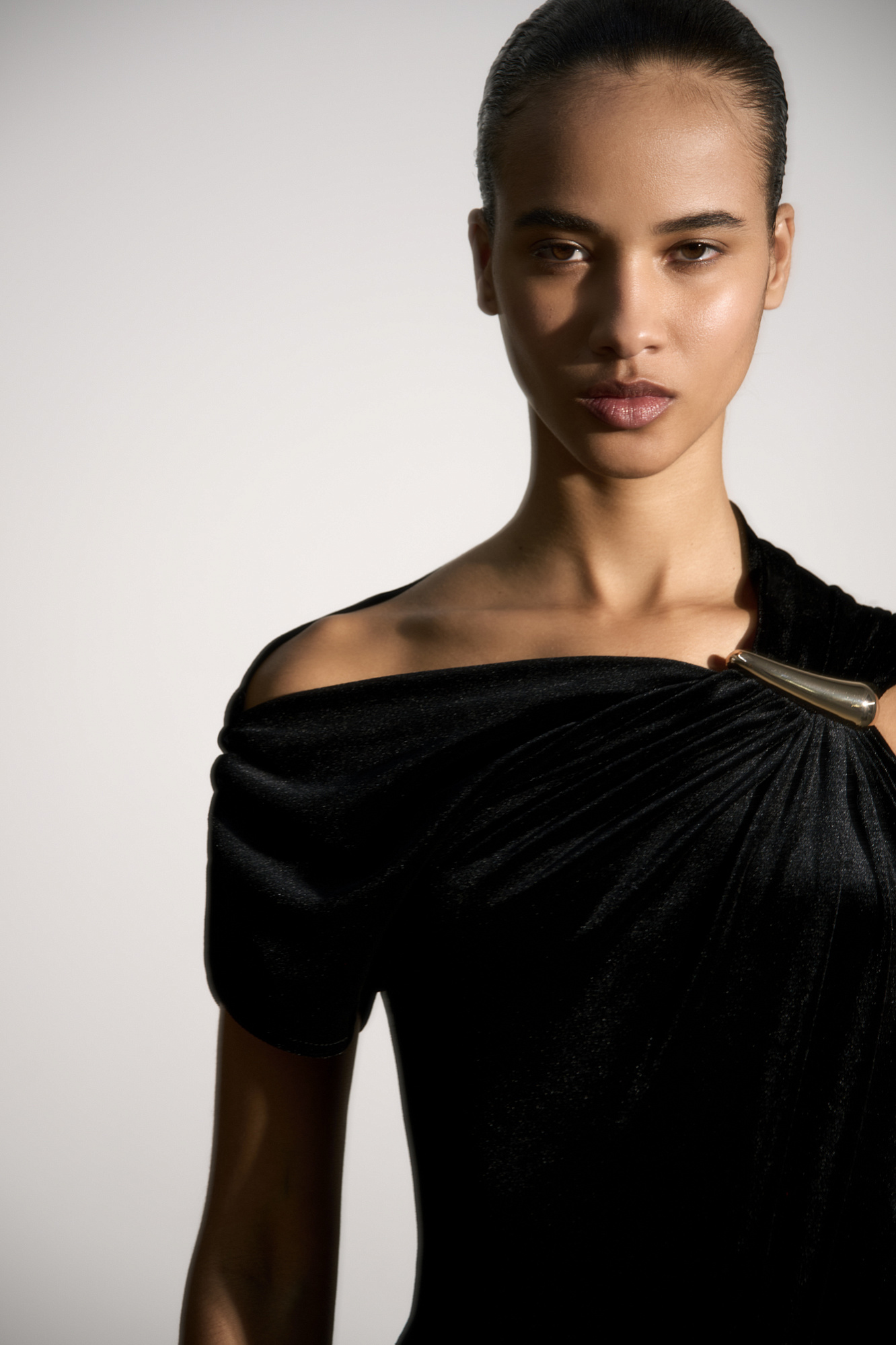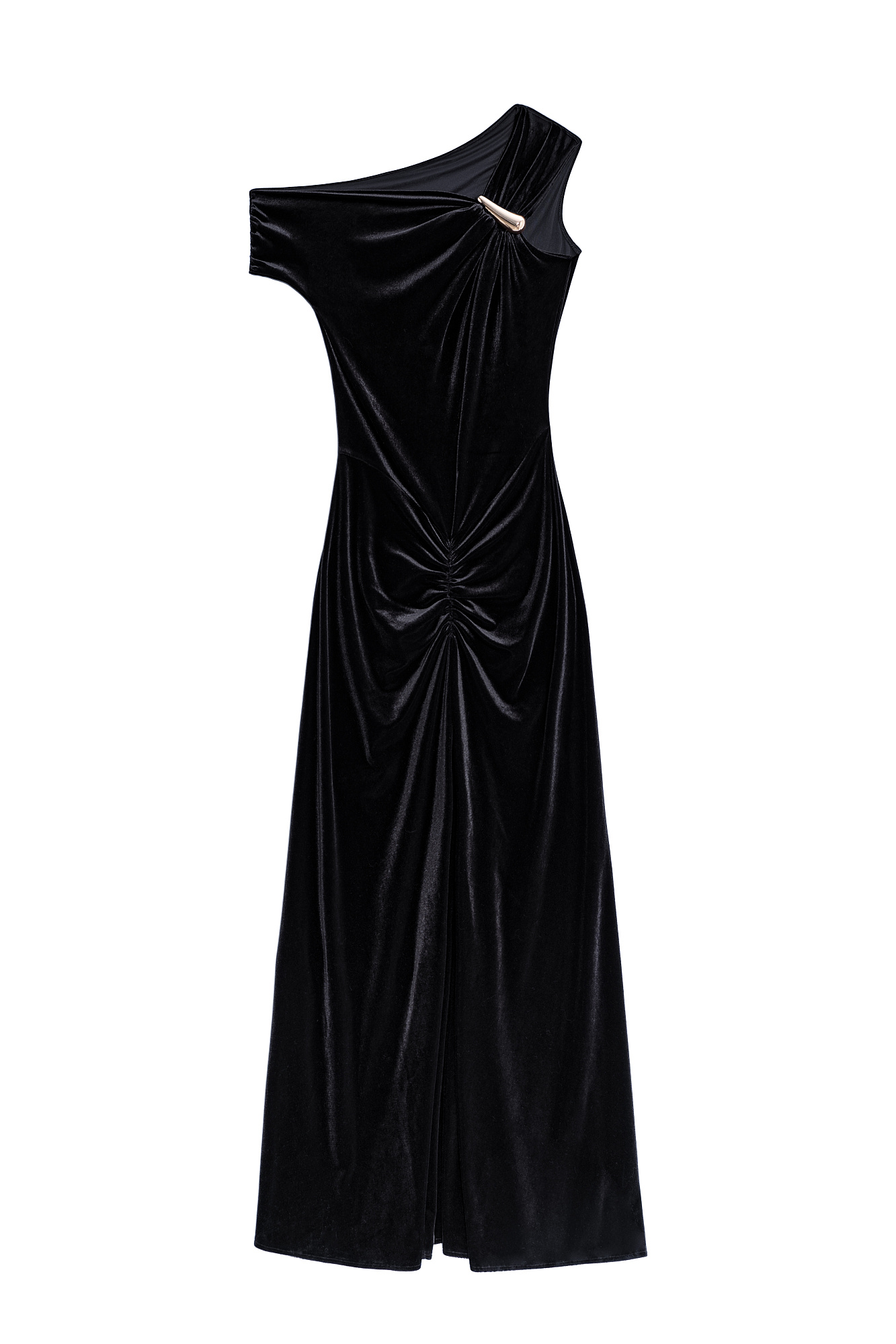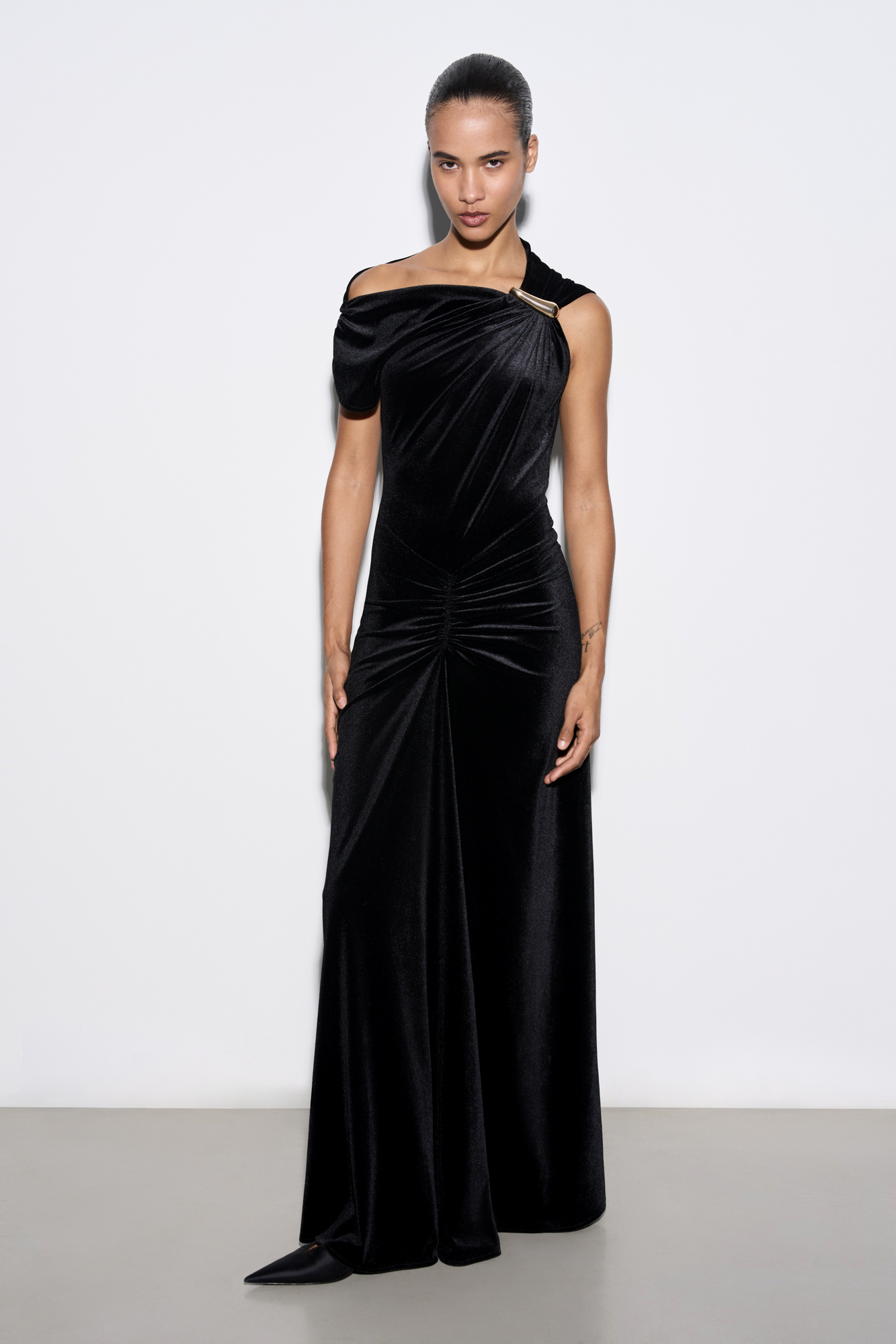 Вечернее платье длины макси из бархатной вискозы. Модель асимметричного кроя с одним коротким рукавом и перемычкой на плече. Изделие декорировано драпировкой.