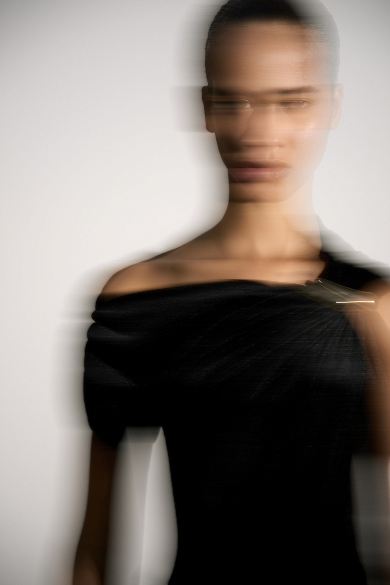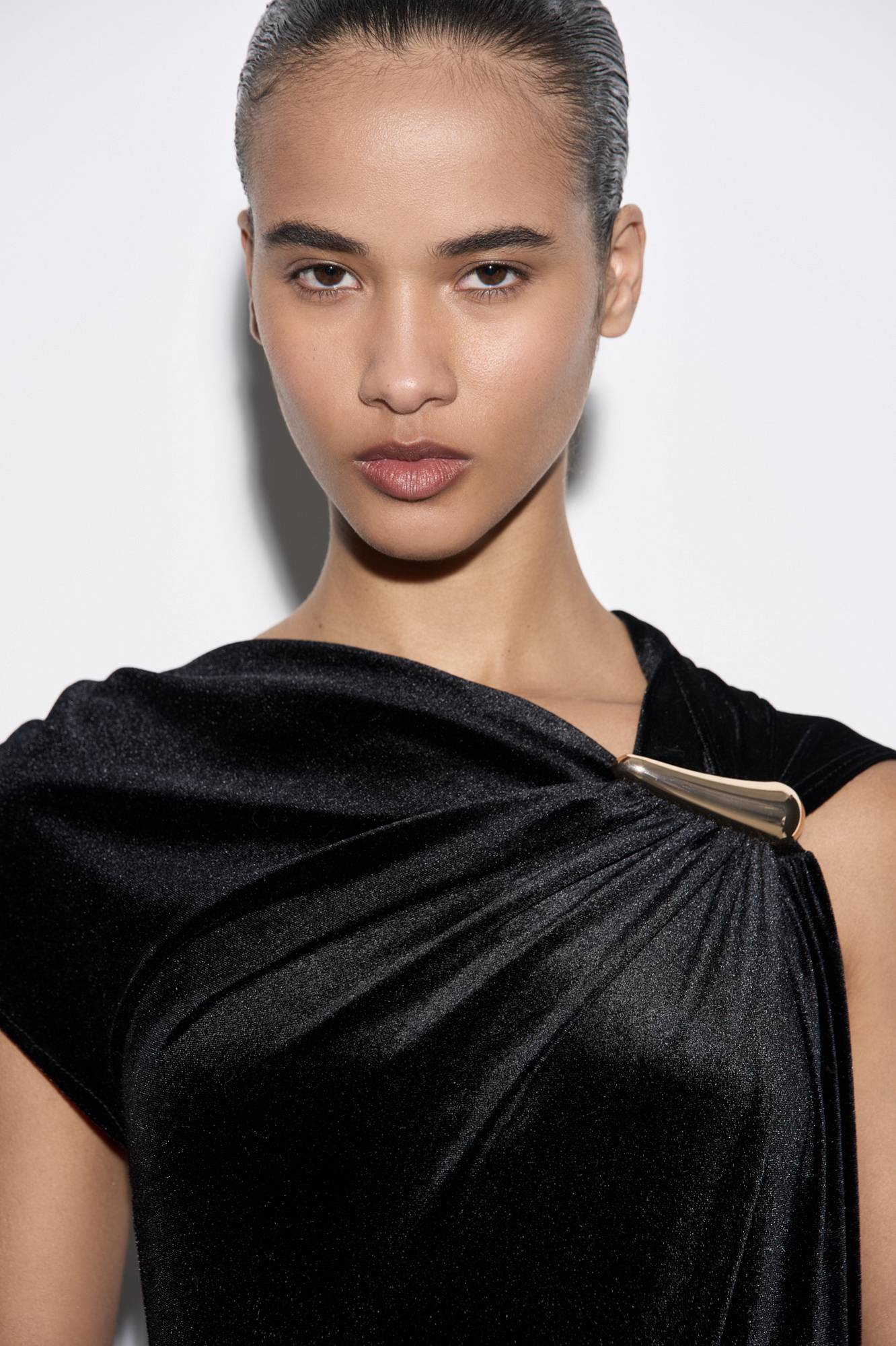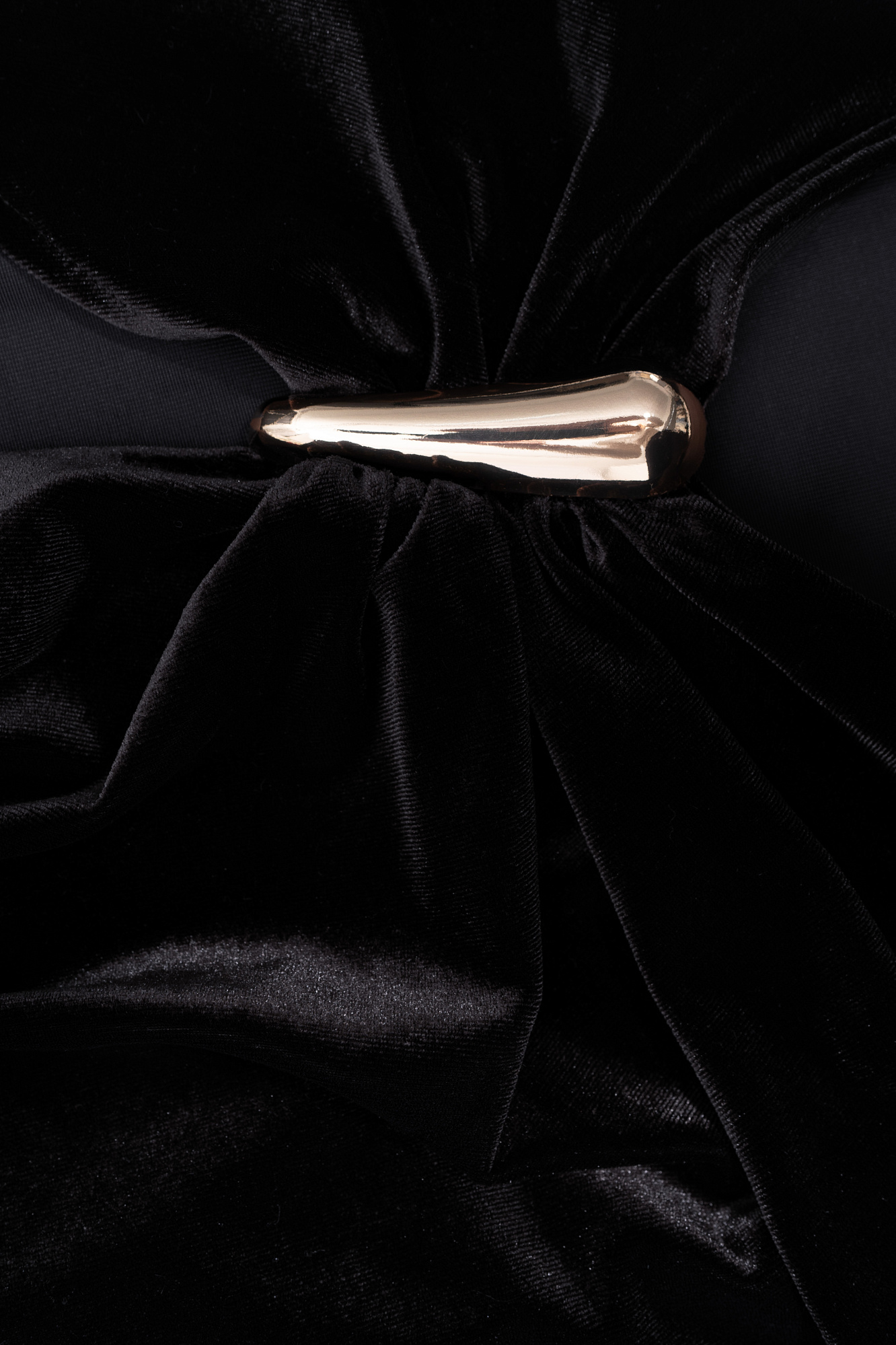 Вечернее платье длины макси из бархатной вискозы. Модель асимметричного кроя с одним коротким рукавом и перемычкой на плече. Изделие декорировано драпировкой.