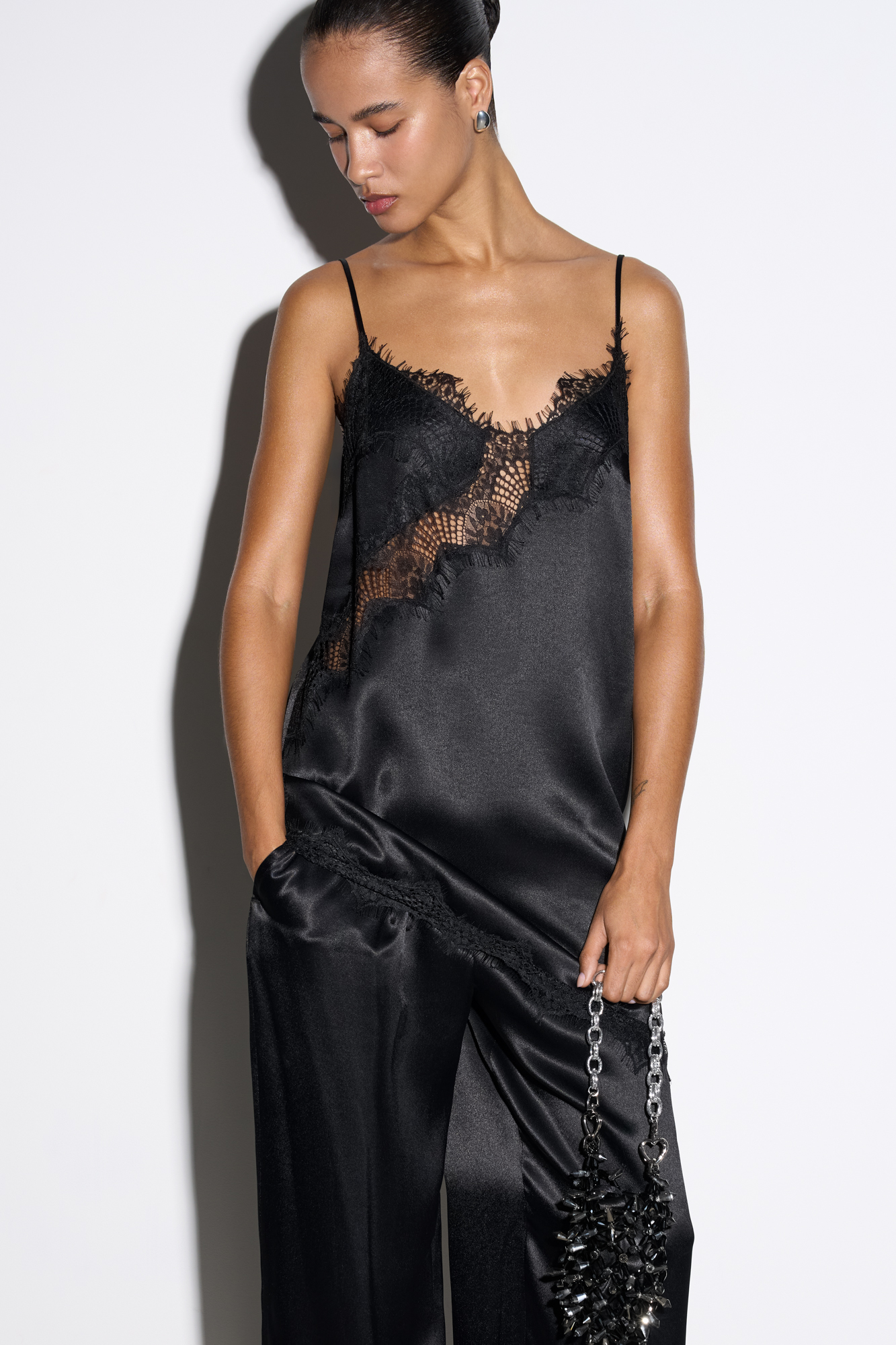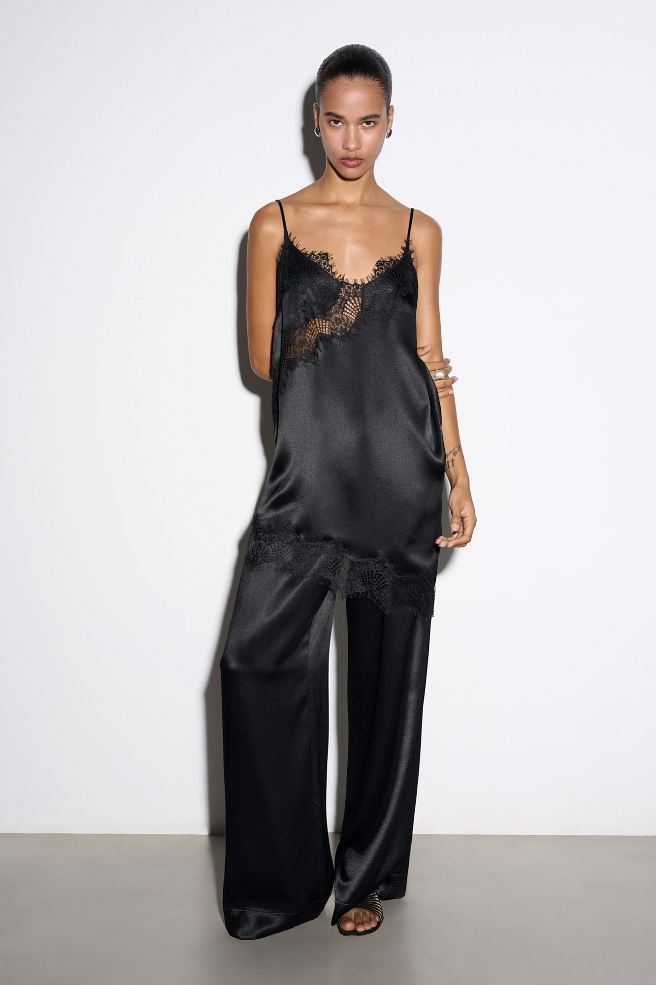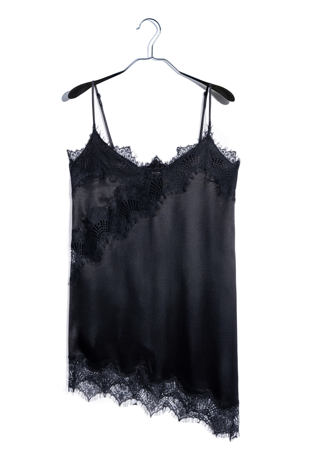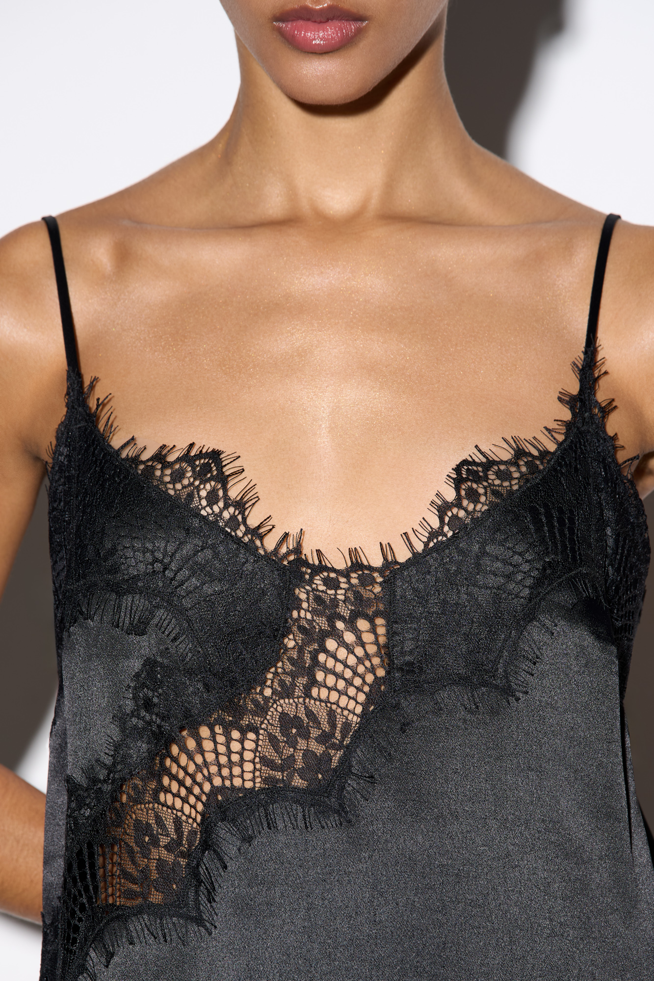 Платье-комбинация длины мини из 100% вискозы. Модель на тонких бретельках. Подол и лиф изделия декорированы тонким кружевом контрастного цвета.