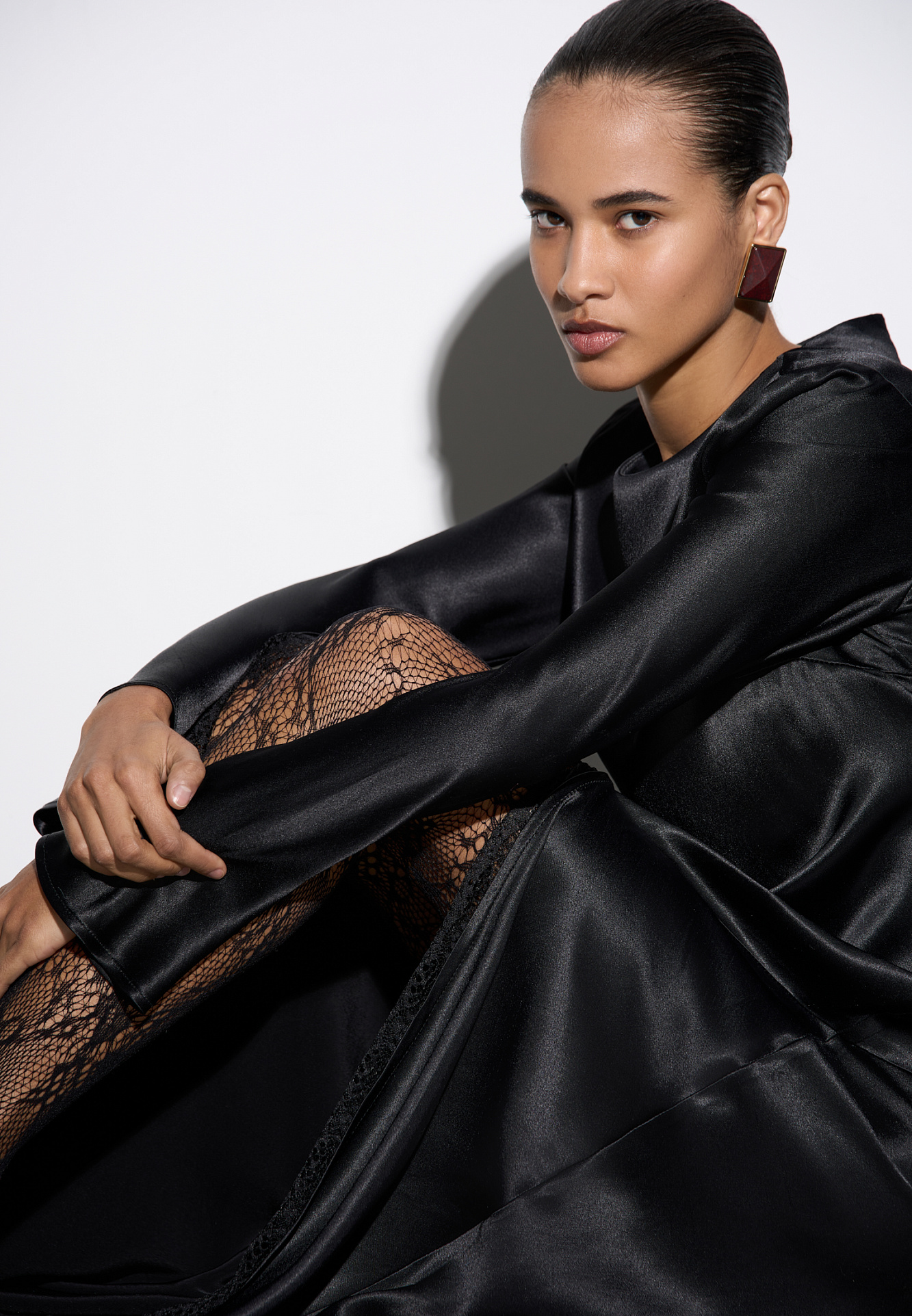Платье длины макси из атласной вискозы. Модель приталенного силуэта с длинными рукавами и круглым вырезом. Высокий разрез на юбке декорирован кружевом.