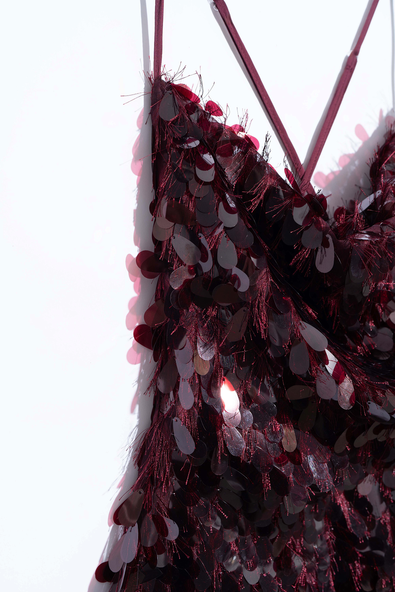 Вечернее платье-футляр длины миди, декорированное пайетками и бахромой. Модель по фигуре на тонких регулируемых бретельках.