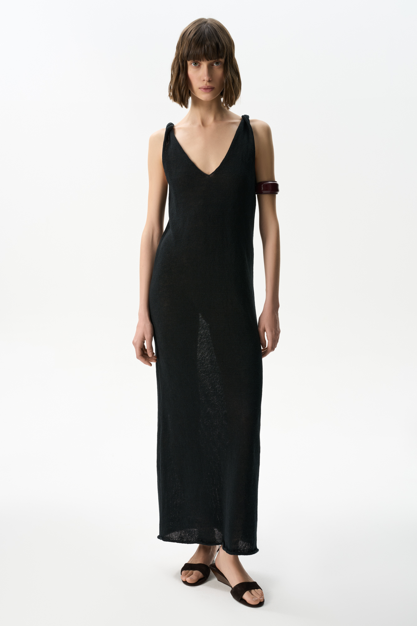 Сарафан длины макси из 100% льна. Модель прямого кроя с перекрученными бретелями и V-образным вырезом.