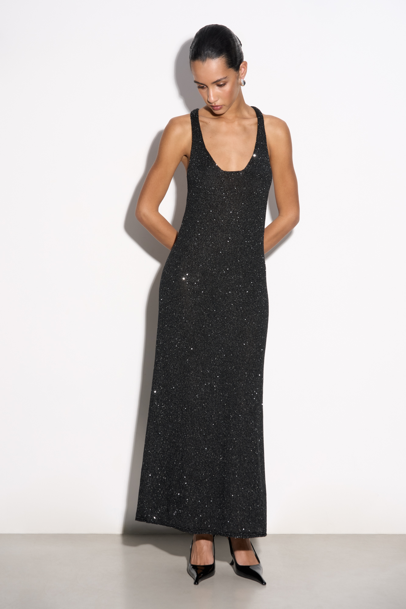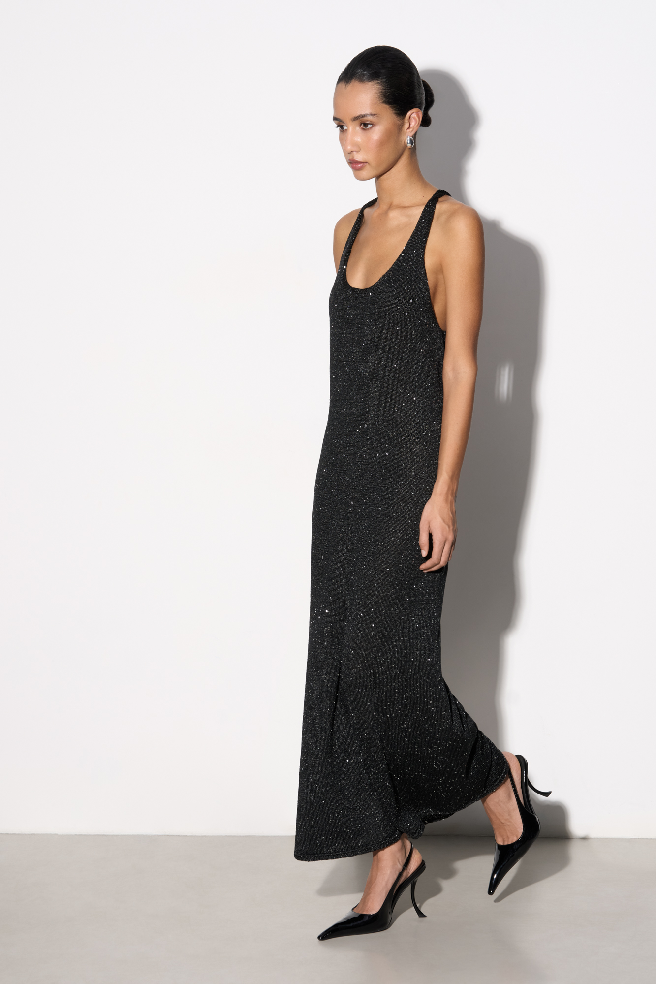 Трикотажный сарафан длины макси из хлопка с пайетками. Модель свободного кроя, на широких бретелях с перекрутом на спине и глубоким U-образным вырезом.