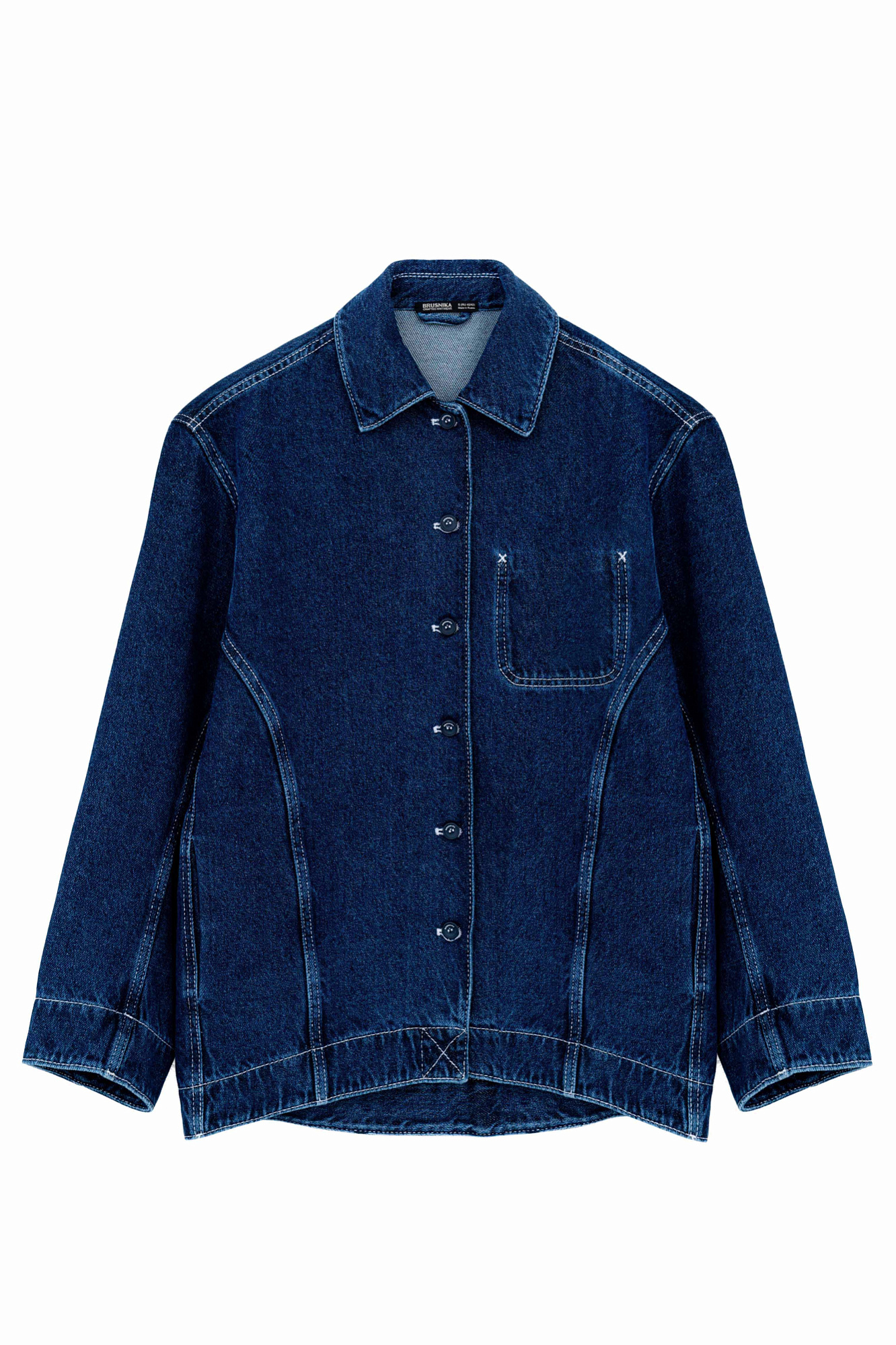 Джинсовая рубашка с рельефными швами и контрастной строчкой. Модель свободного силуэта со спущенной линией плеча и застежкой на пуговицы. Имитация кармана на груди.