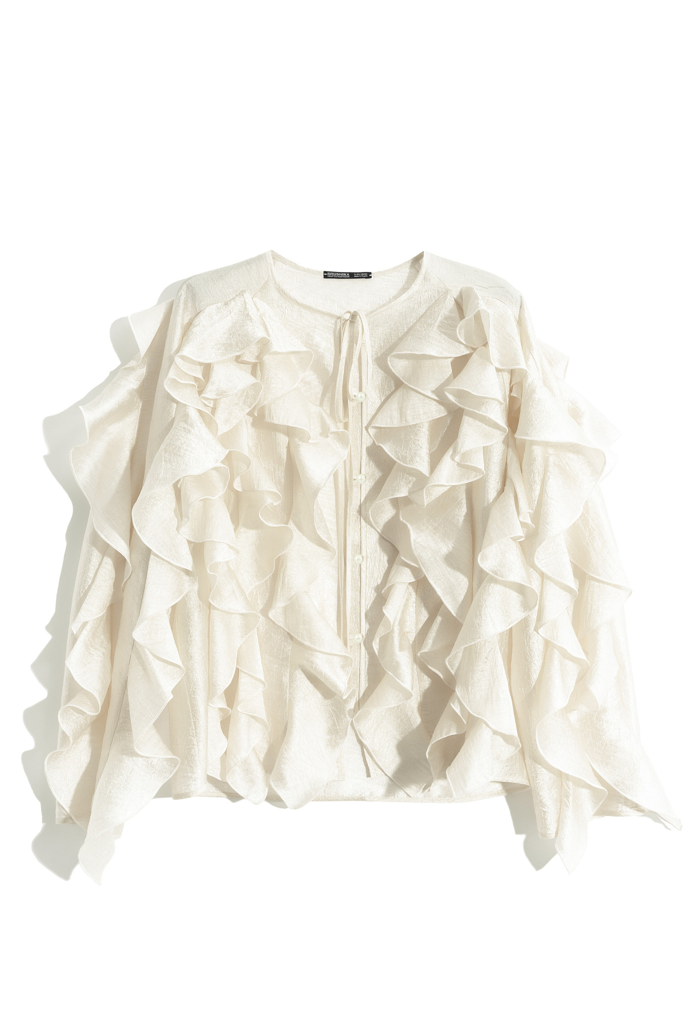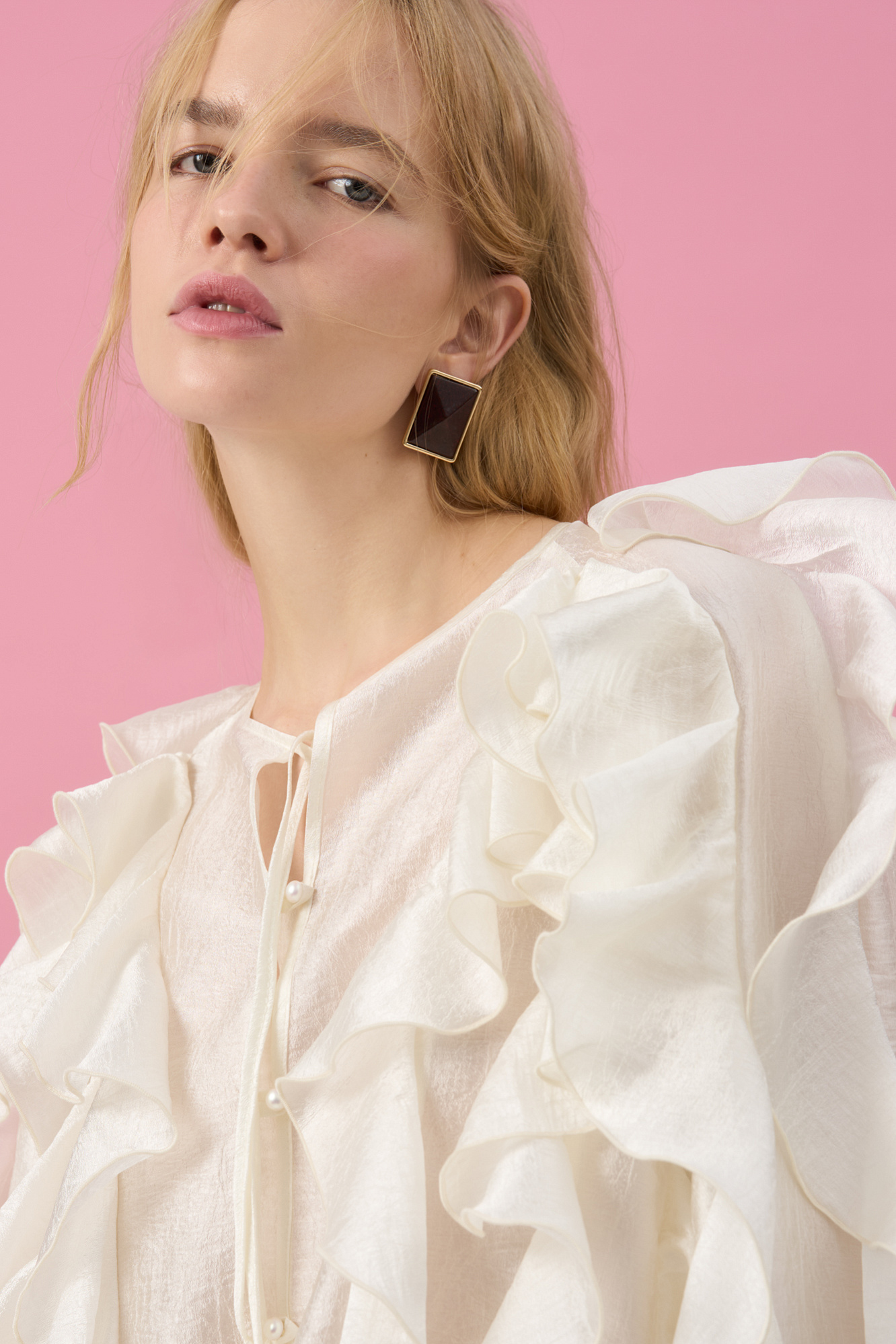 Блуза из тонкой вискозы. Модель свободного силуэта с объемными рукавами и V-образным вырезом, фиксирующимся завязками. Изделие декорировано воланами. Застежка на пуговицы.