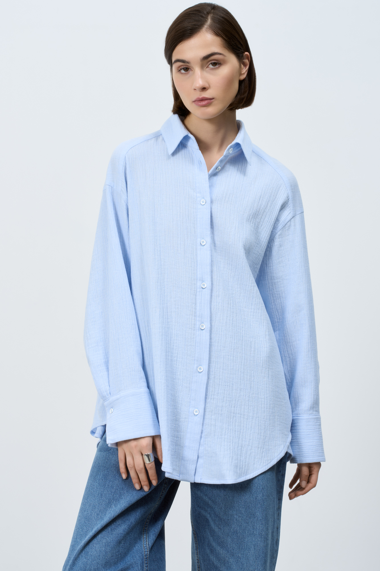 Рубашка из 100% текстурного хлопка. Модель свободного силуэта, со спущенной линией плеч, классическим отложным воротником и длинными рукавами с манжетами. Застежка на пуговицы.