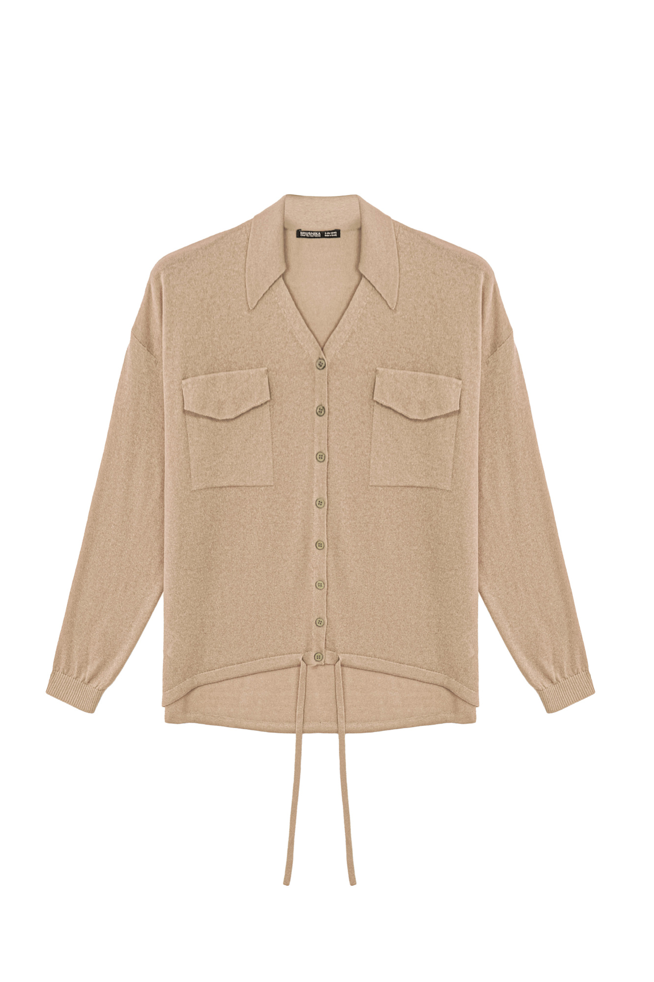 Трикотажная рубашка на пуговицах и кулиской внизу. Накладные карманы на груди.