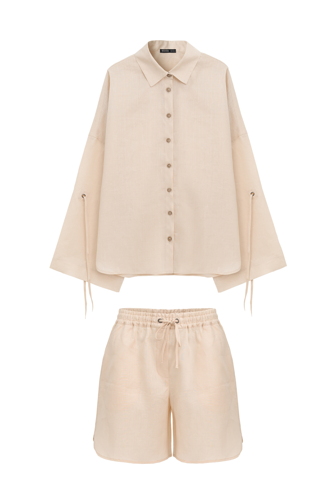 Комплект из 100% крапивы, состоящий из рубашки и шорт. Рубашка с длинными расклешенными рукавами на кулиске, классическим отложным воротником и застежкой на пуговицы. Короткие шорты с боковыми карманами и эластичным поясом на резинке.