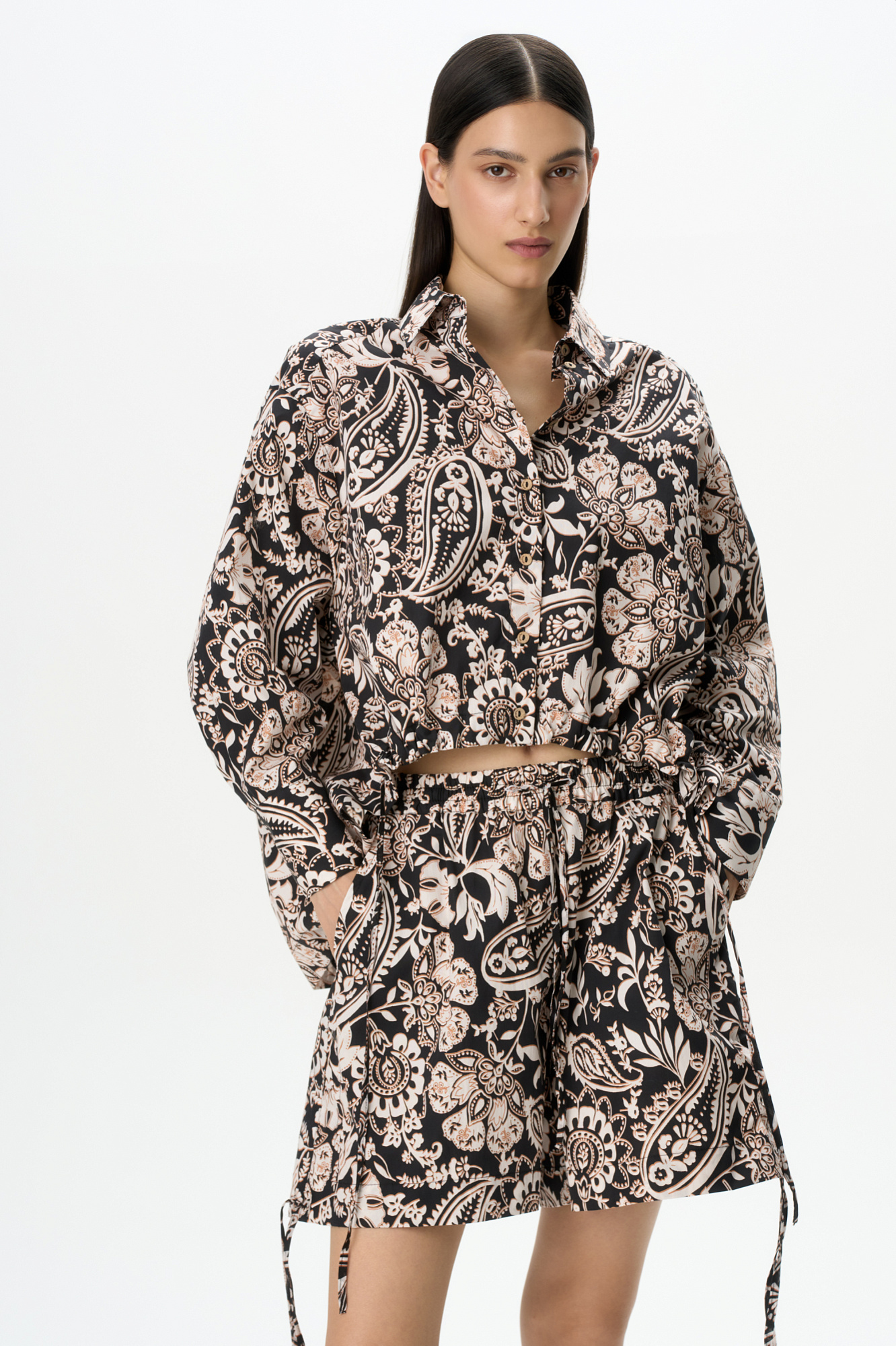 Принтованный костюм из 100% хлопка, состоящий из рубашки и шорт. Рубашка свободного кроя, с длинными рукавами, классическим отложным воротником и кулиской по низу изделия. Короткие шорты с карманами, широким поясом на кулиске и завязками по бокам.