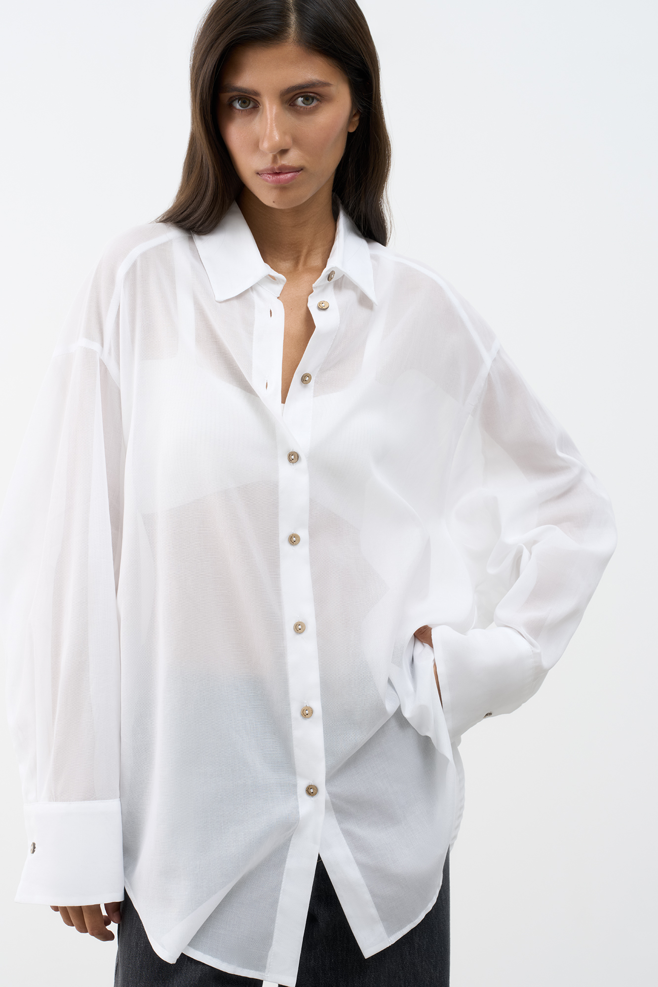 Классическая рубашка из тонкого хлопка. Отложной воротник, длинные рукава с манжетами на пуговицах и закругленный нижний край. Застежка на пуговицы.