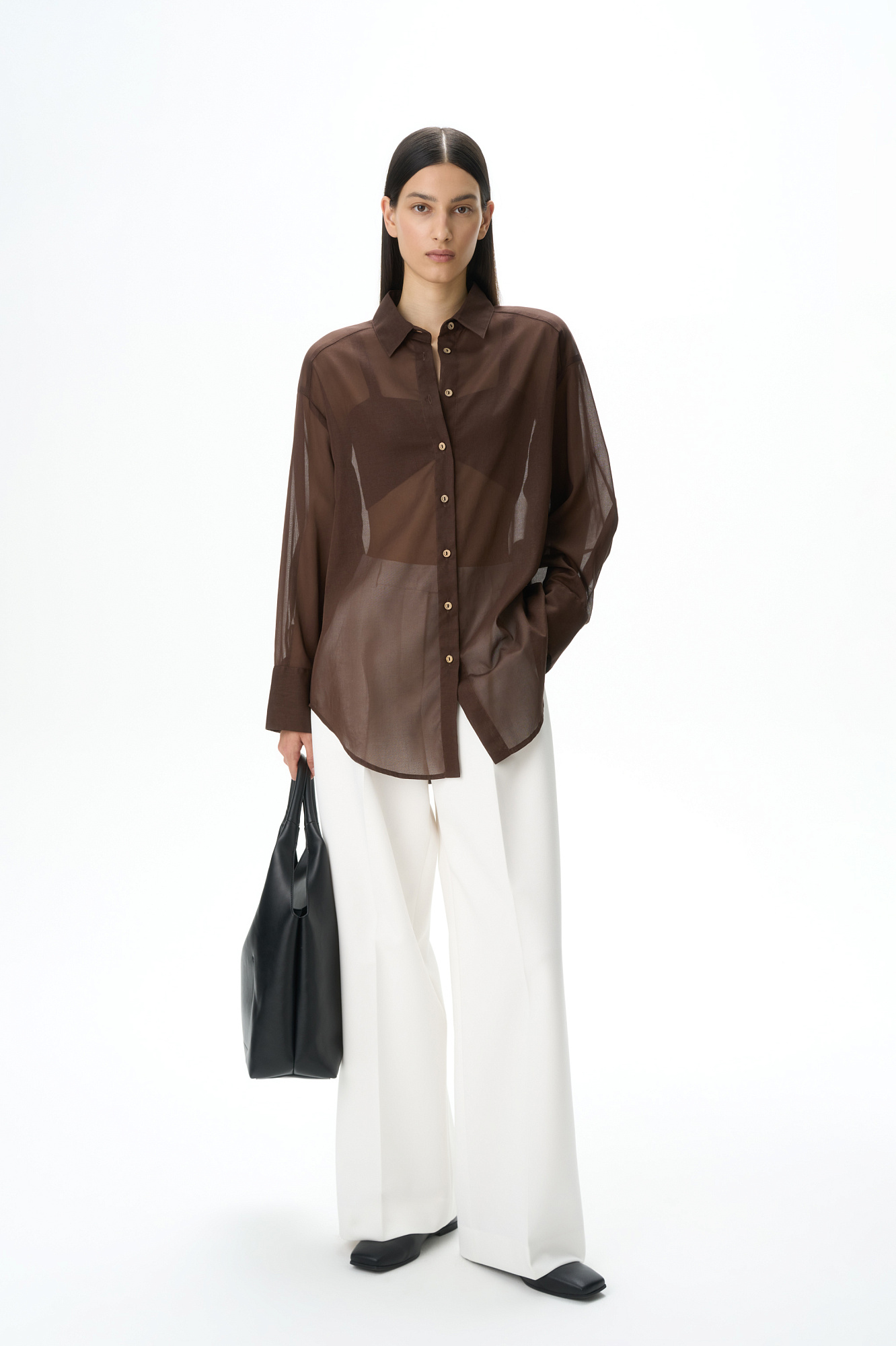 Классическая рубашка из тонкого хлопка. Отложной воротник, длинные рукава с манжетами на пуговицах и закругленный нижний край. Застежка на пуговицы.