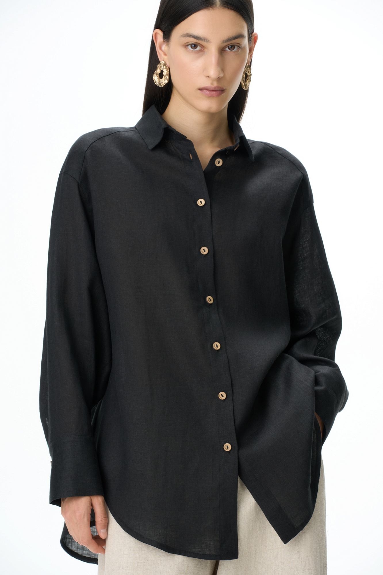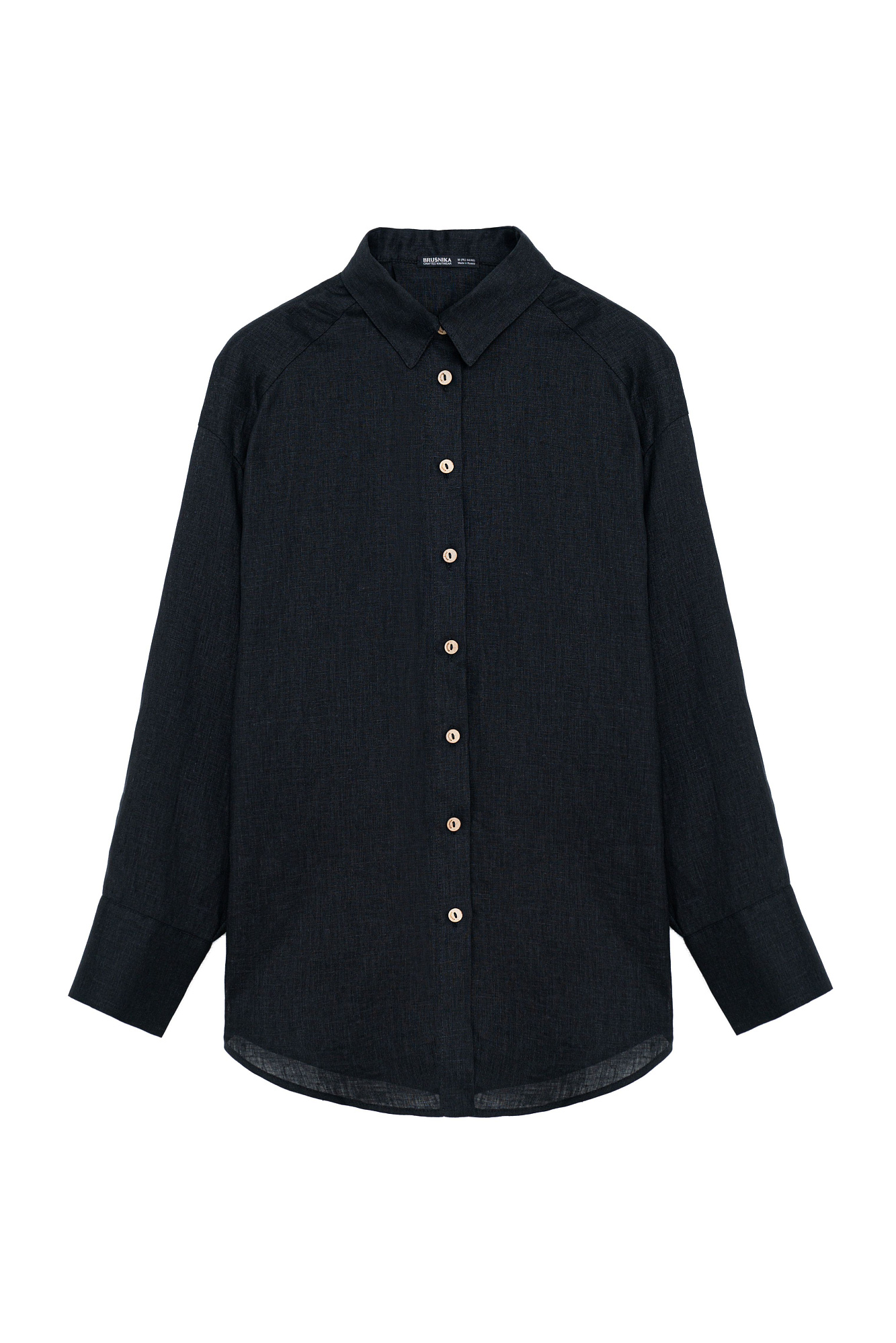 Классическая рубашка из 100% льна. Модель прямого кроя с отложным воротником, длинными рукавами с манжетами на пуговицах и закругленным нижним краем. Застежка на пуговицы.