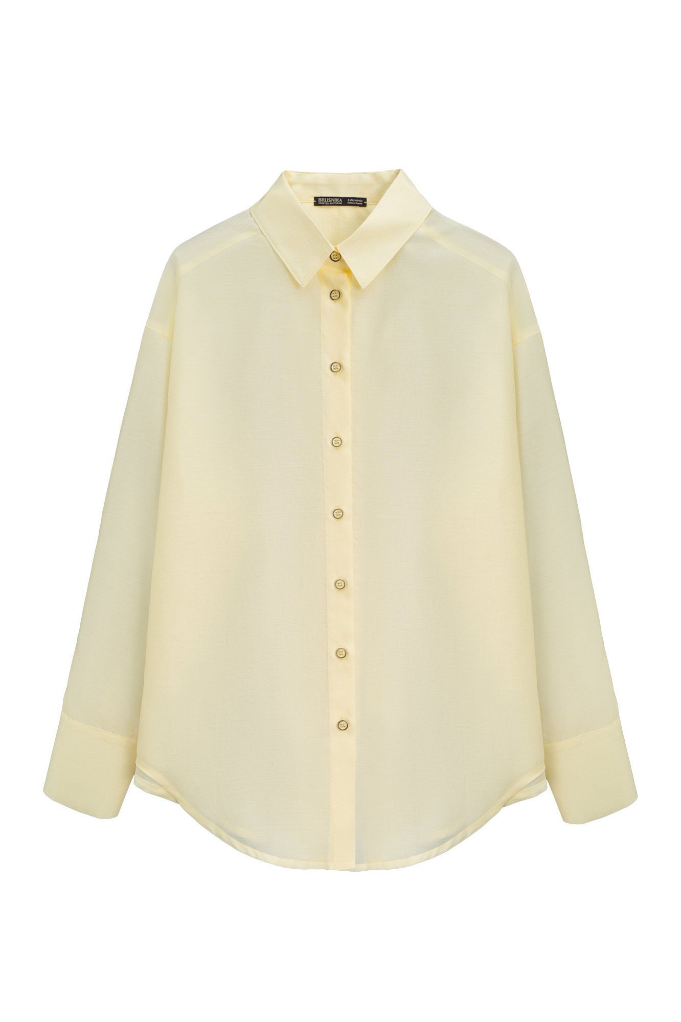 Классическая рубашка из тонкого шелка и хлопка. Модель свободного кроя, с отложным воротником, длинными рукавами с манжетами на пуговицах. Нижний край изделия выполнен полукругом. Застежка на пуговицы.