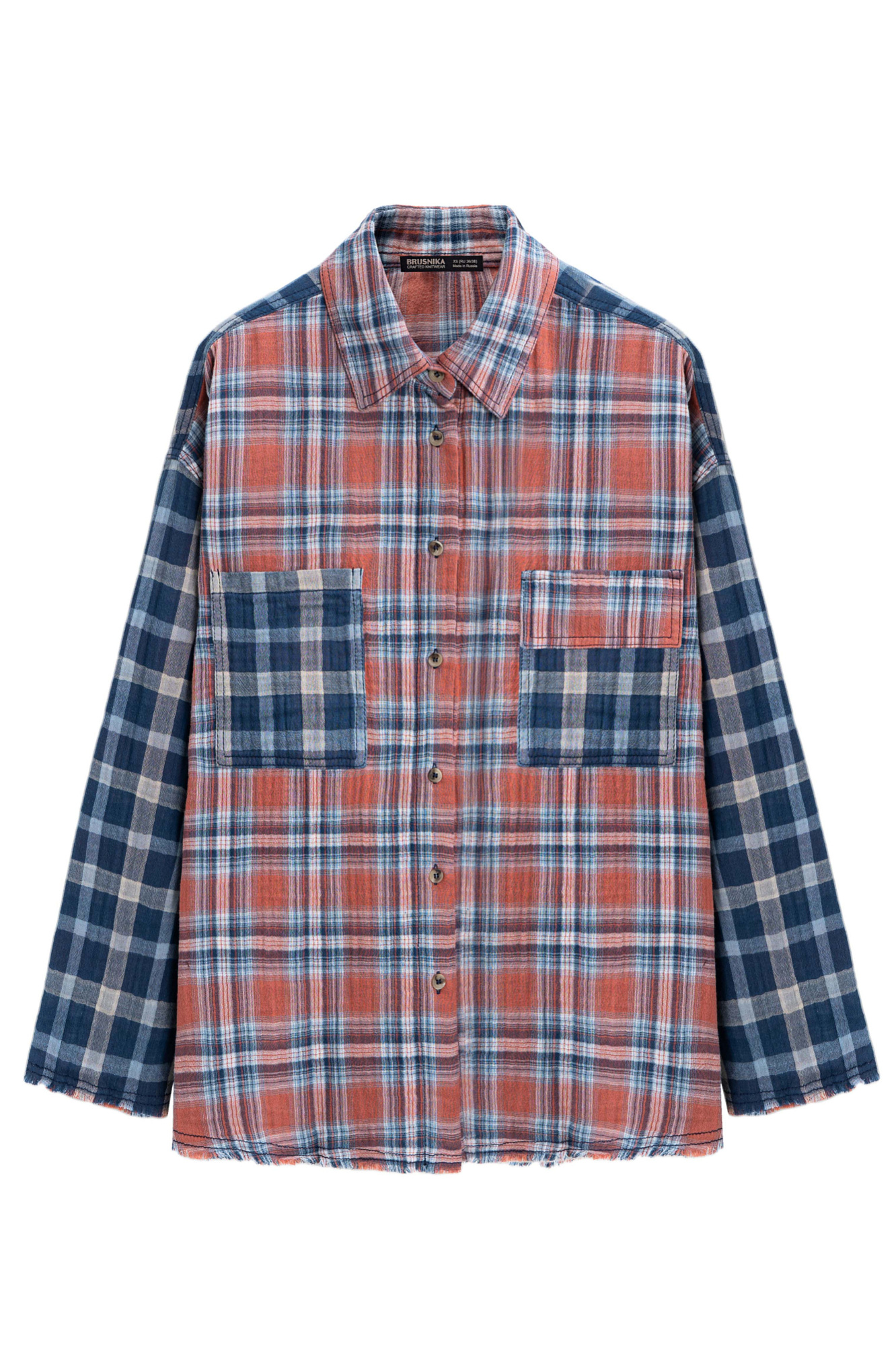 Рубашка в клетку из 100% хлопка. Модель прямого кроя, со спущенной линией плеч, длинными рукавами, классическим отложным воротником, двумя нагрудными карманами, один из них с клапаном. Манжеты и низ изделия выполнены с эффектом необработанного края. Застежка на пуговицы.