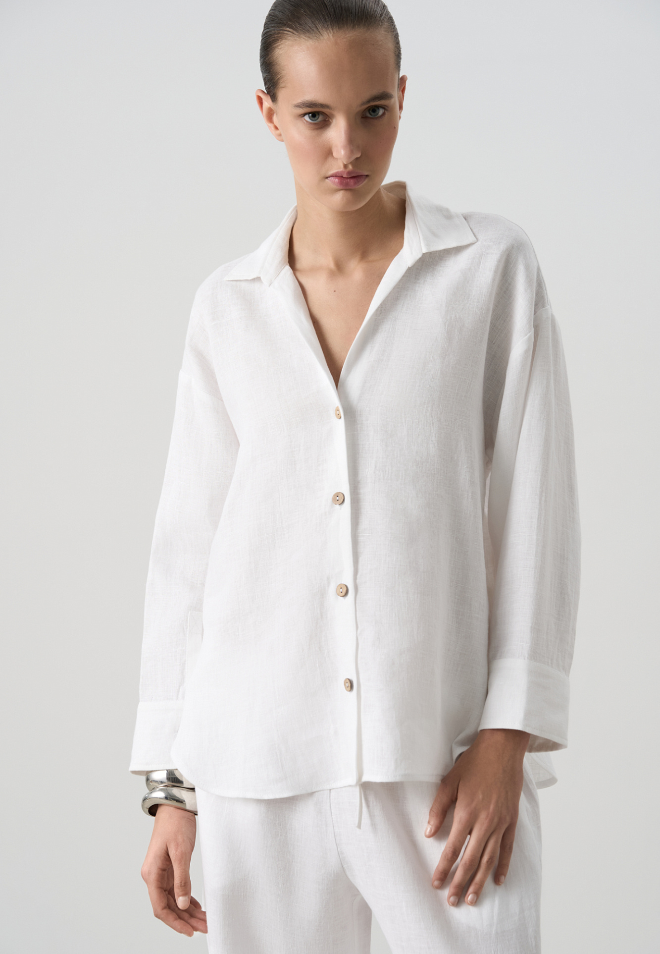 Рубашка из 100% льна. Модель свободного кроя, с отложным воротником, V-образным вырезом, длинными рукавами с манжетами на пуговицах.