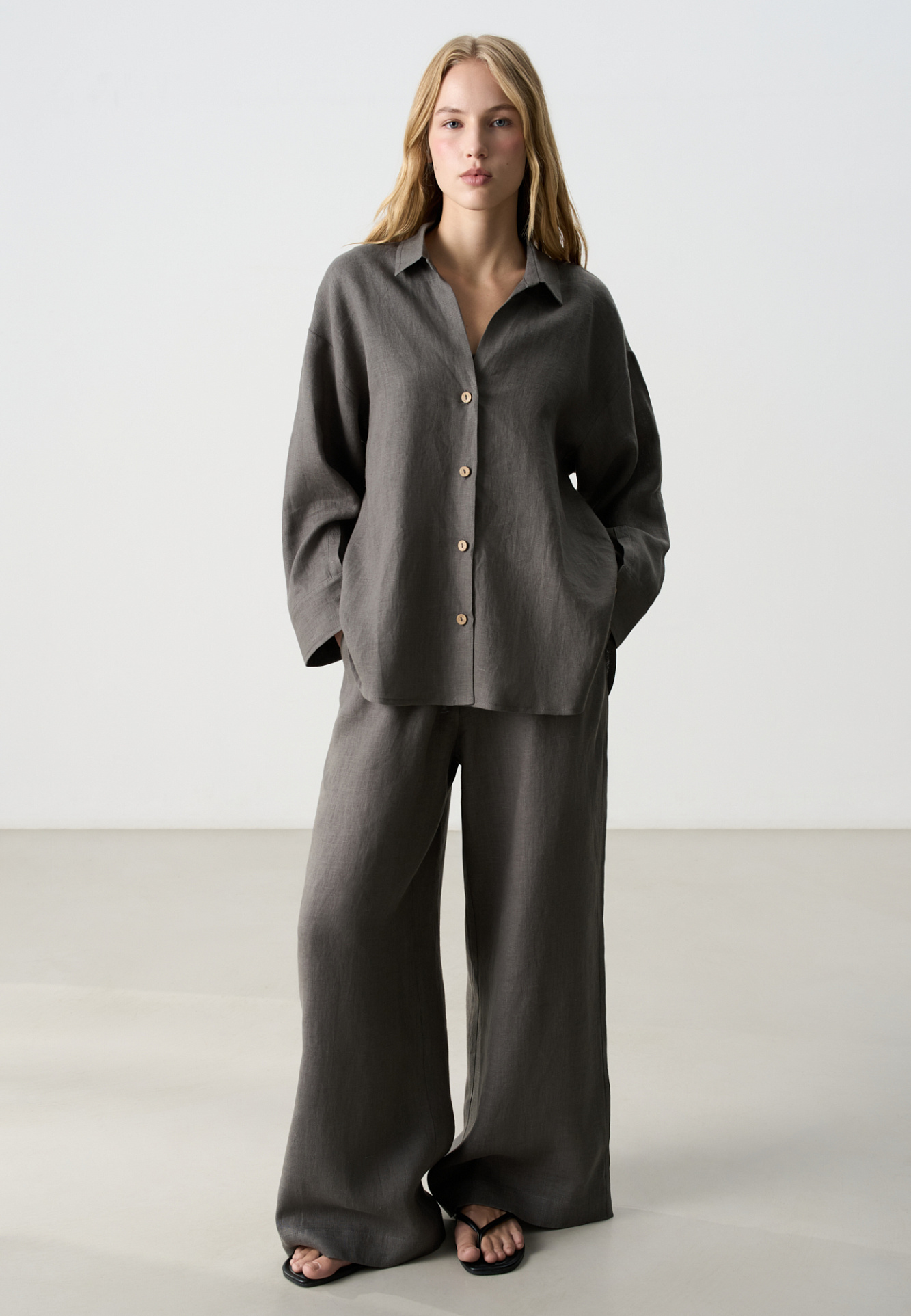 Рубашка из 100% льна. Модель свободного кроя, с отложным воротником, V-образным вырезом, длинными рукавами с манжетами на пуговицах.