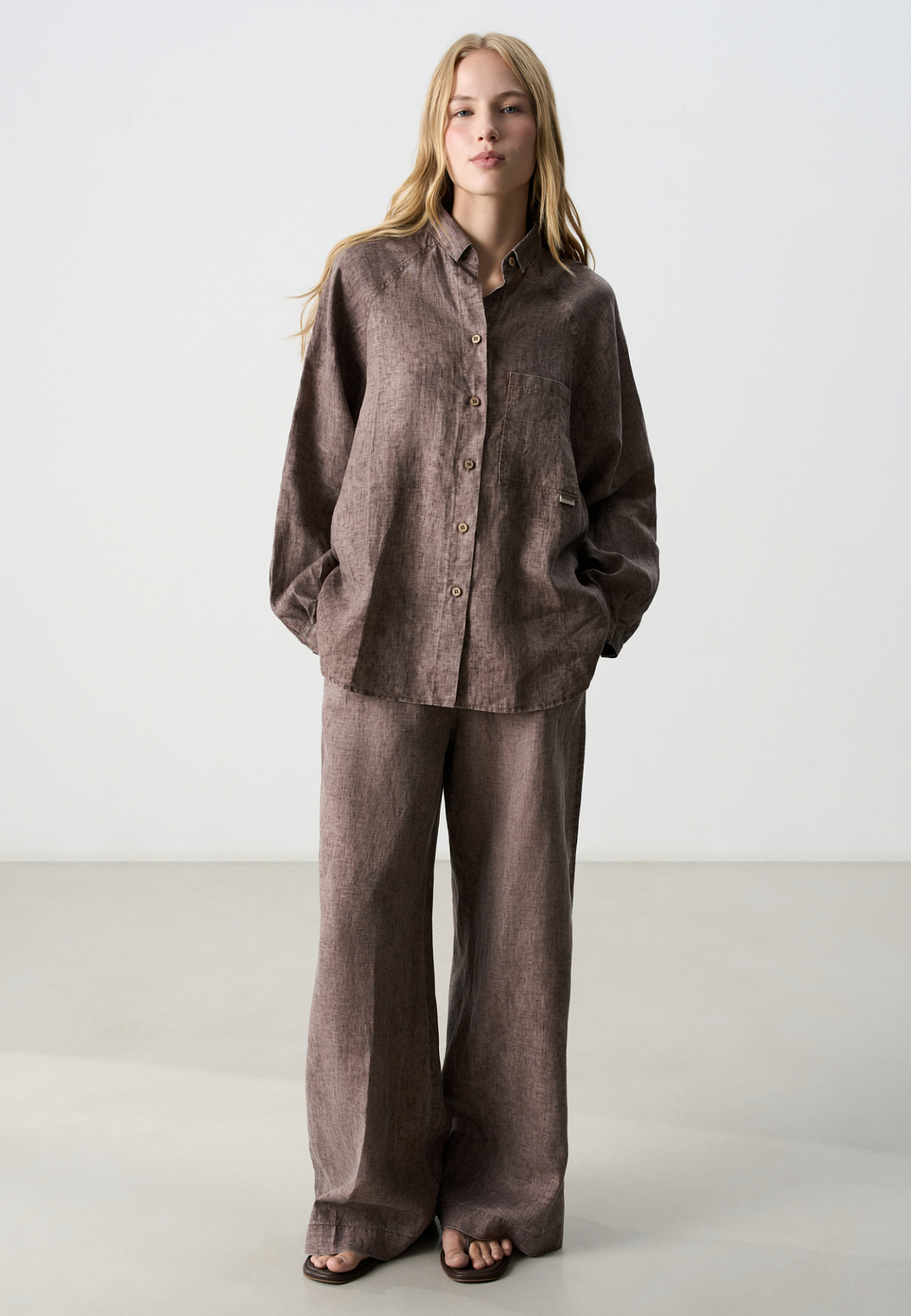 Рубашка из 100% льна. Модель свободного кроя, с длинным рукавом реглан, отложным воротником, нагрудным карманом и удлиненной спинкой. Застежка на пуговицы.