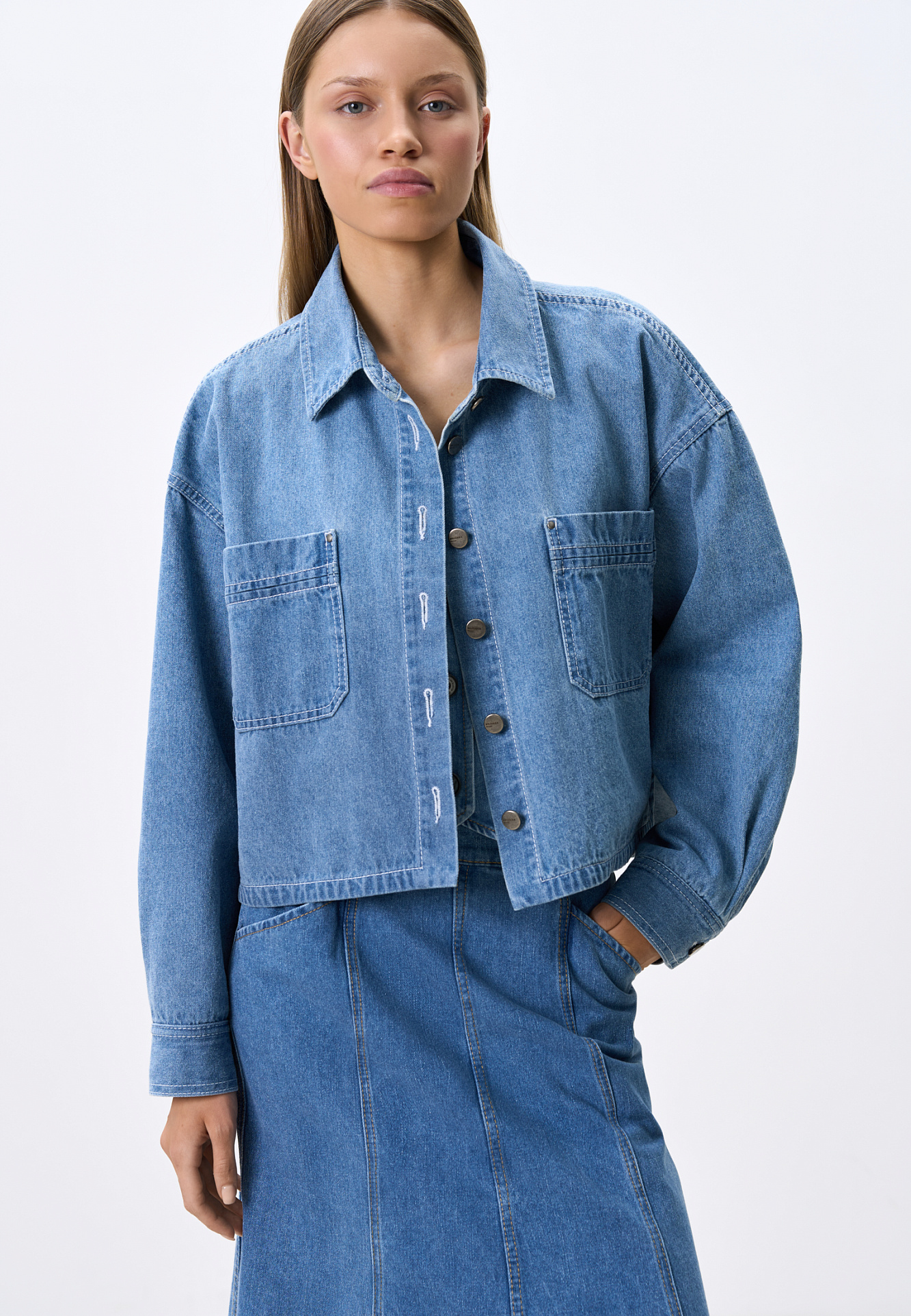 Укороченная джинсовая рубашка из 100% хлопка. Модель свободного силуэта, с отложным воротником, длинными рукавами и нагрудными карманами. Застежка на пуговицы.