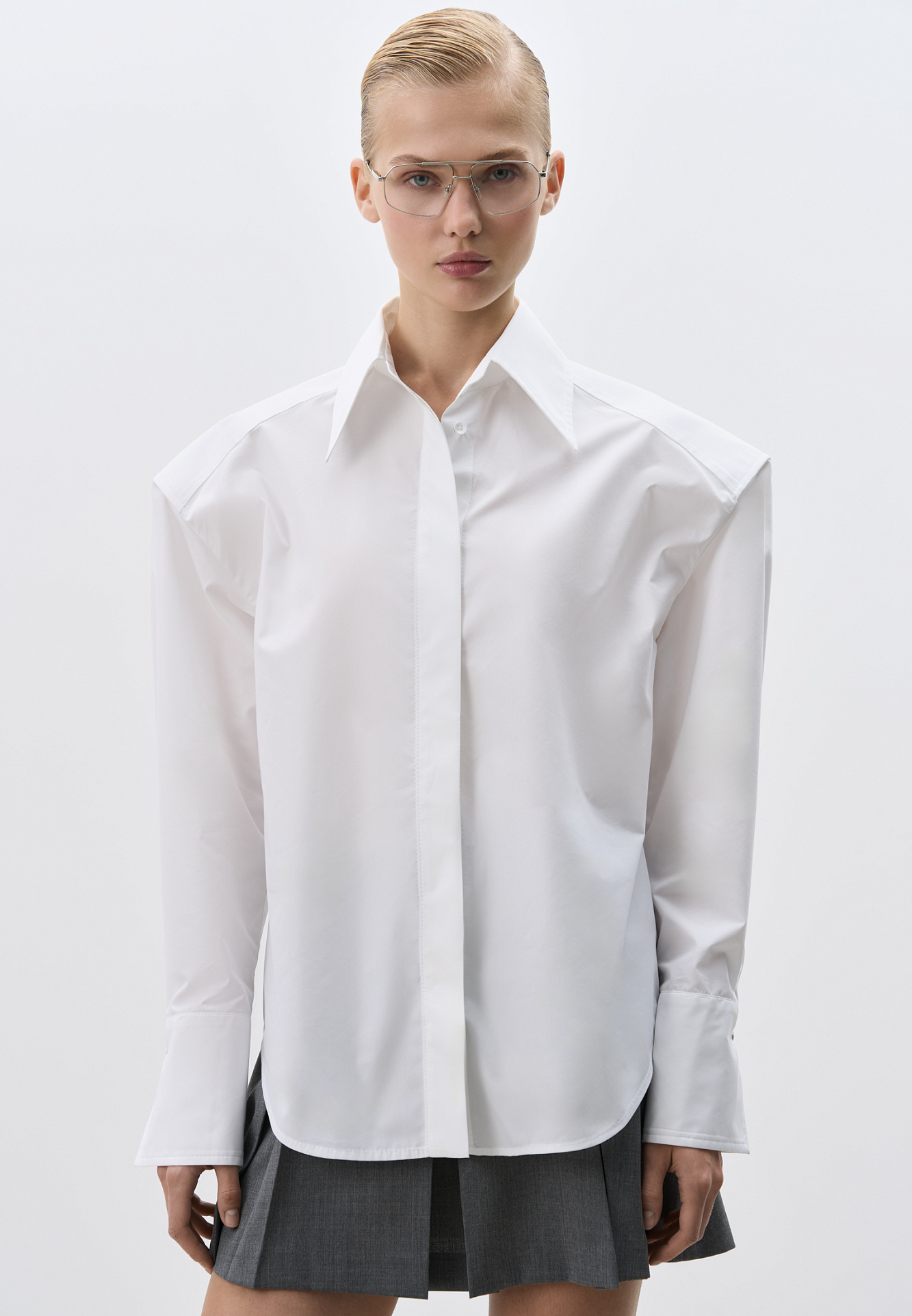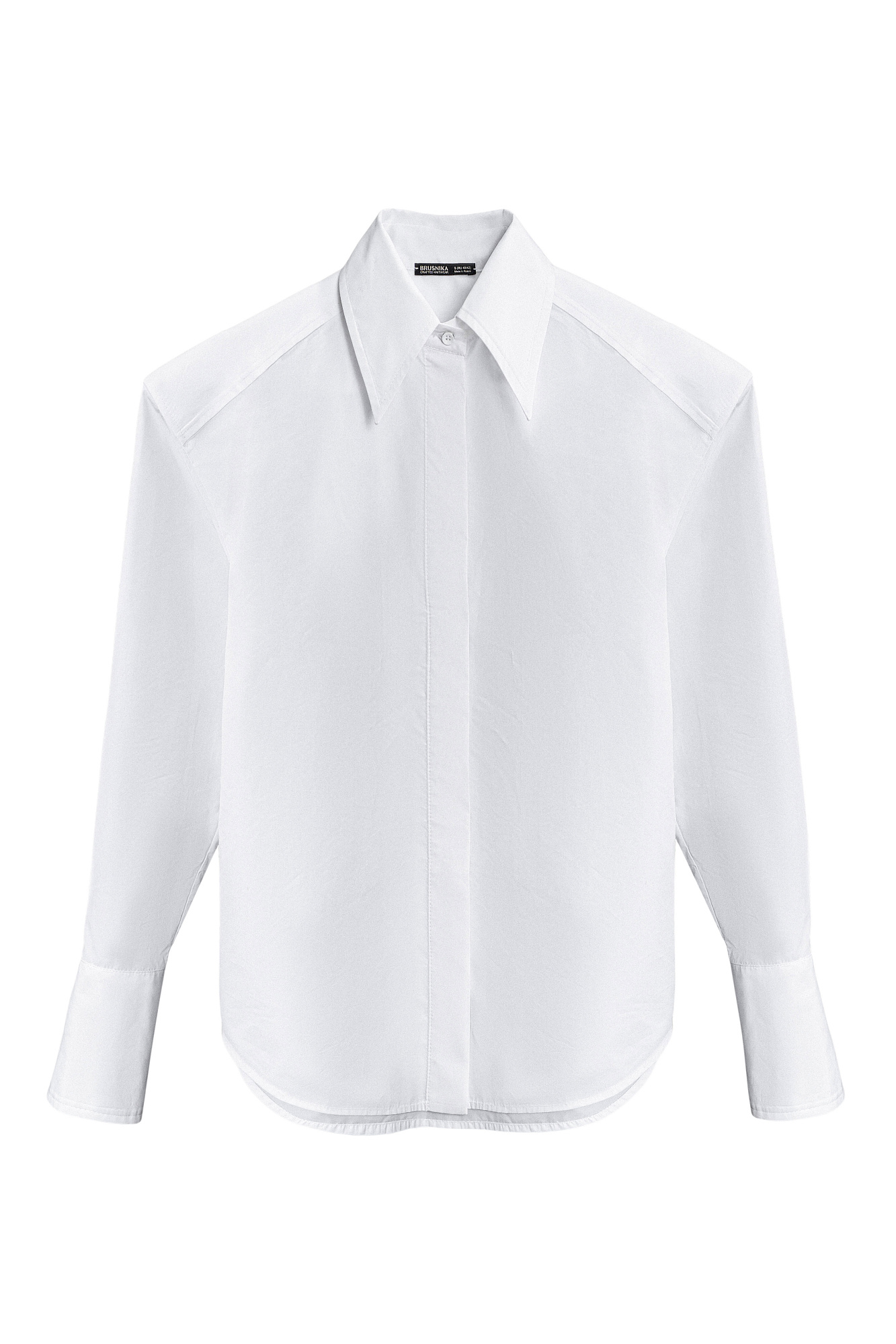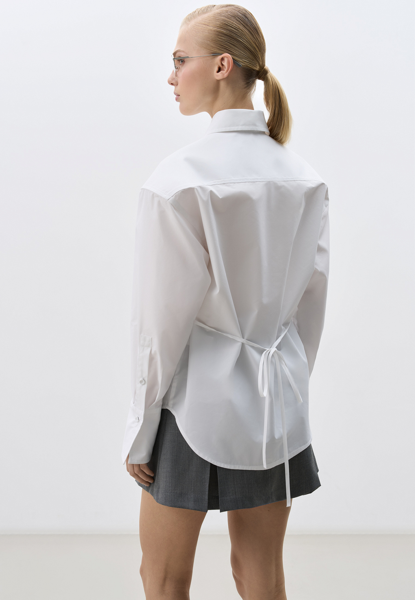 Рубашка из хлопка. Модель прямого кроя, с длинными рукавами с манжетами, классическим отложным воротником, увеличенными плечами и завязкой на спинке. Застежка на пуговицы под планкой.