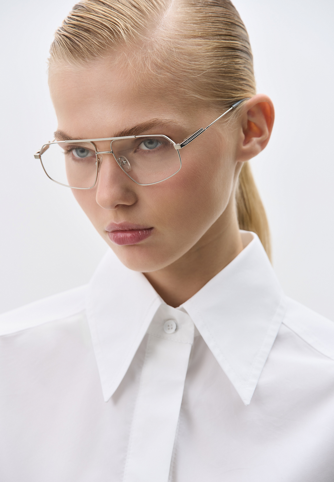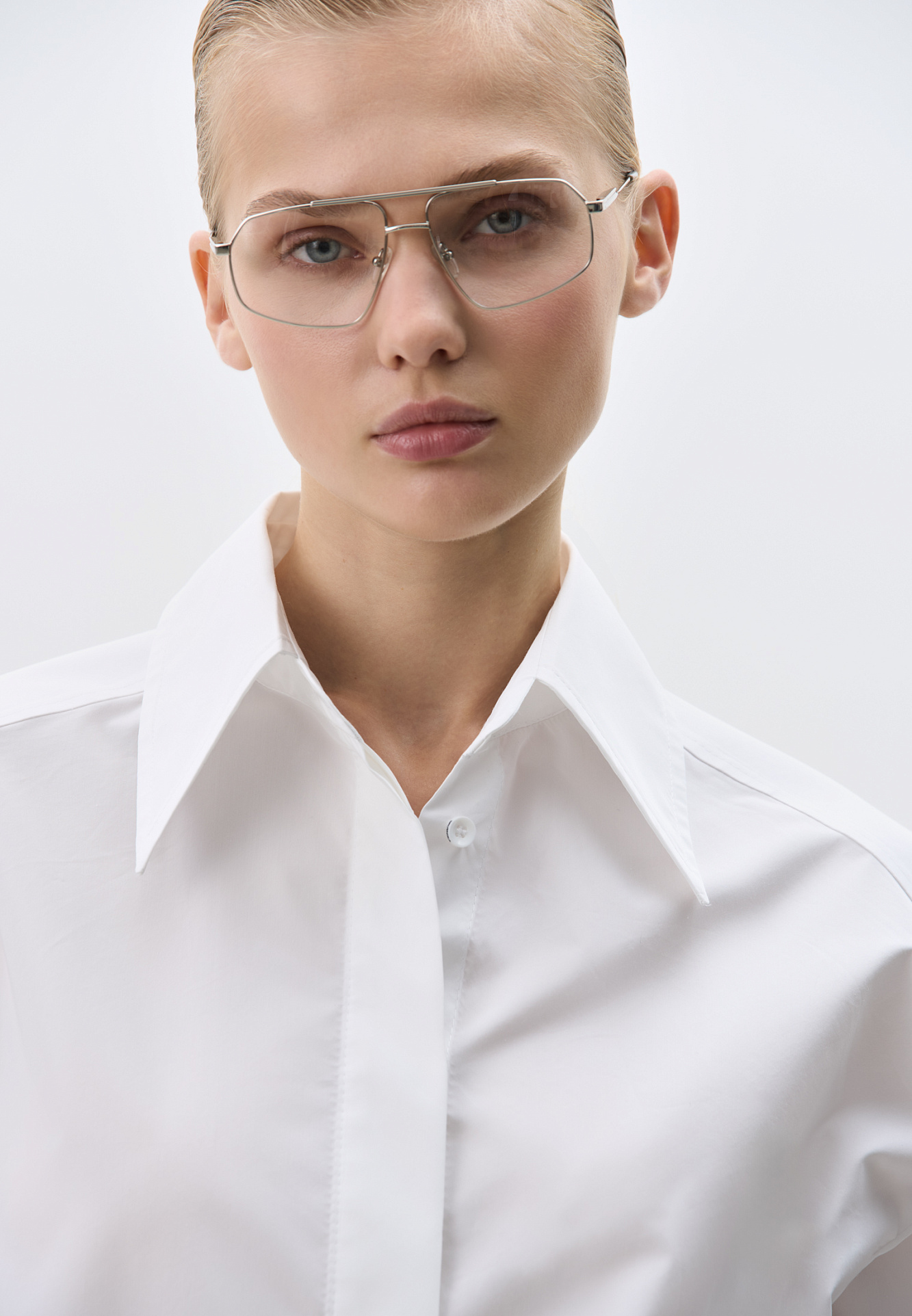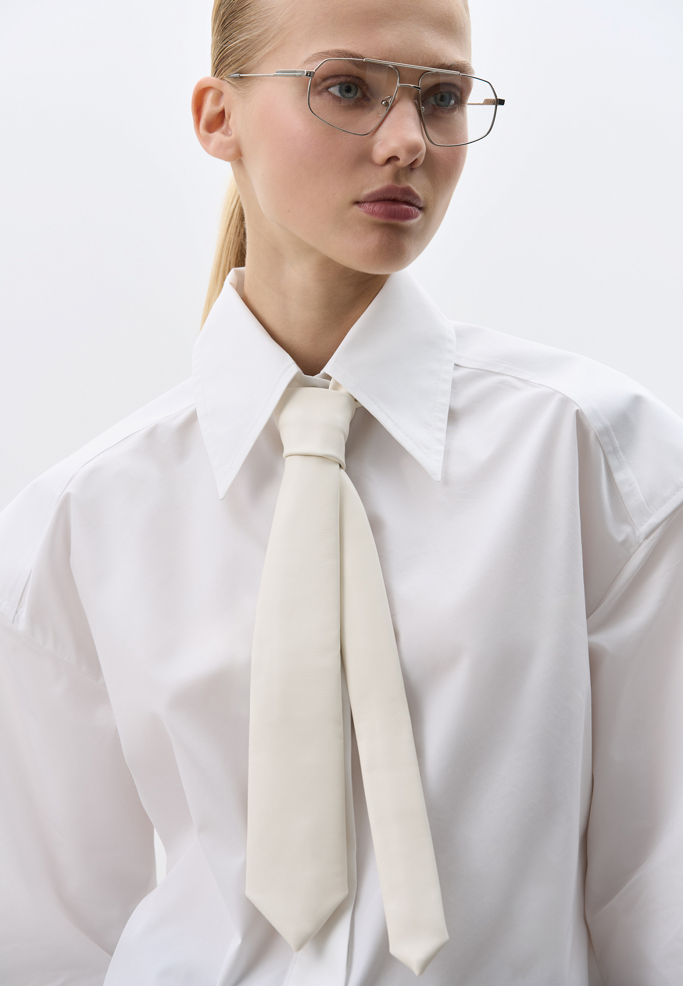Рубашка из хлопка. Модель прямого кроя, с длинными рукавами с манжетами, классическим отложным воротником, увеличенными плечами и завязкой на спинке. Застежка на пуговицы под планкой.