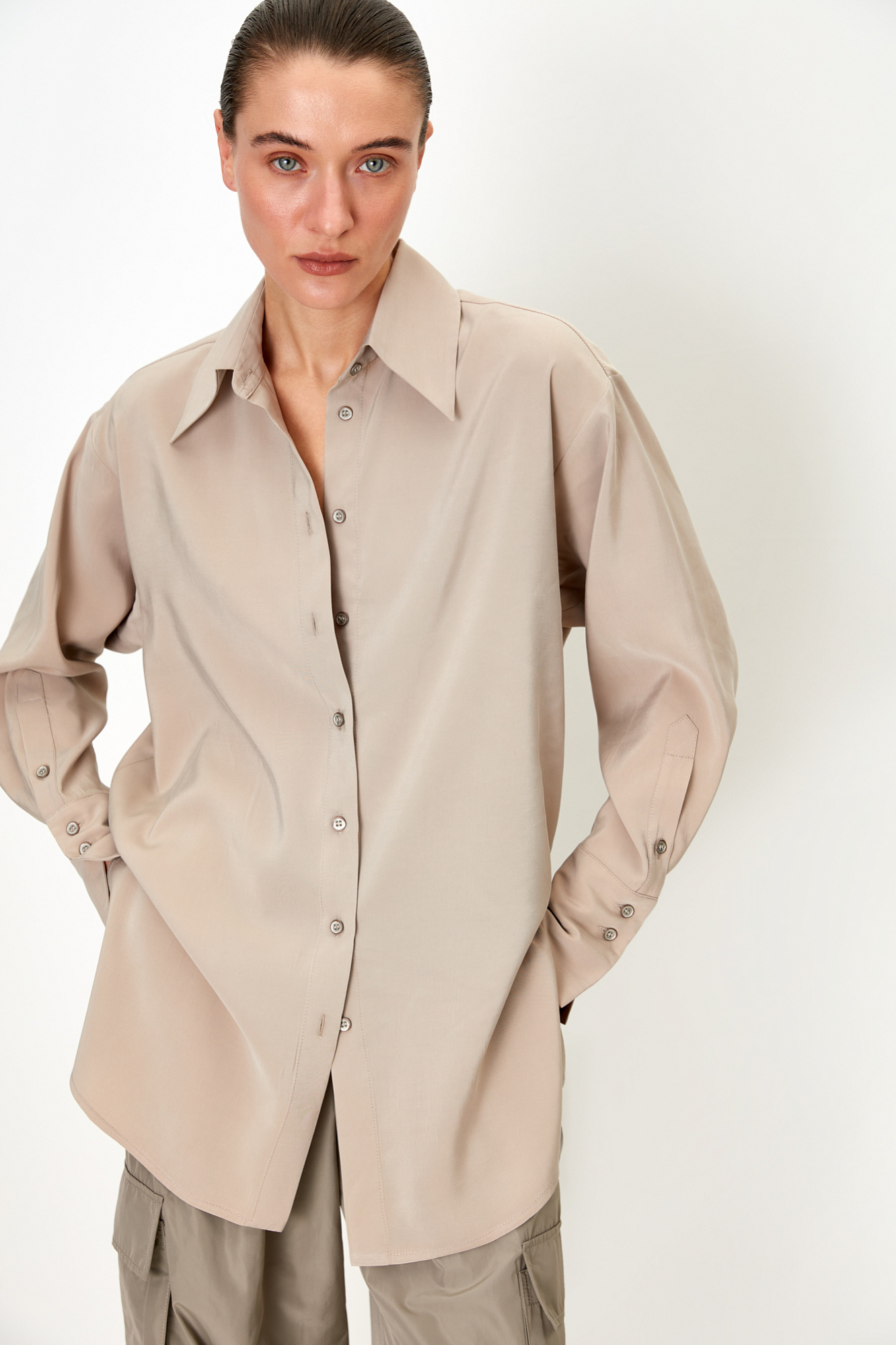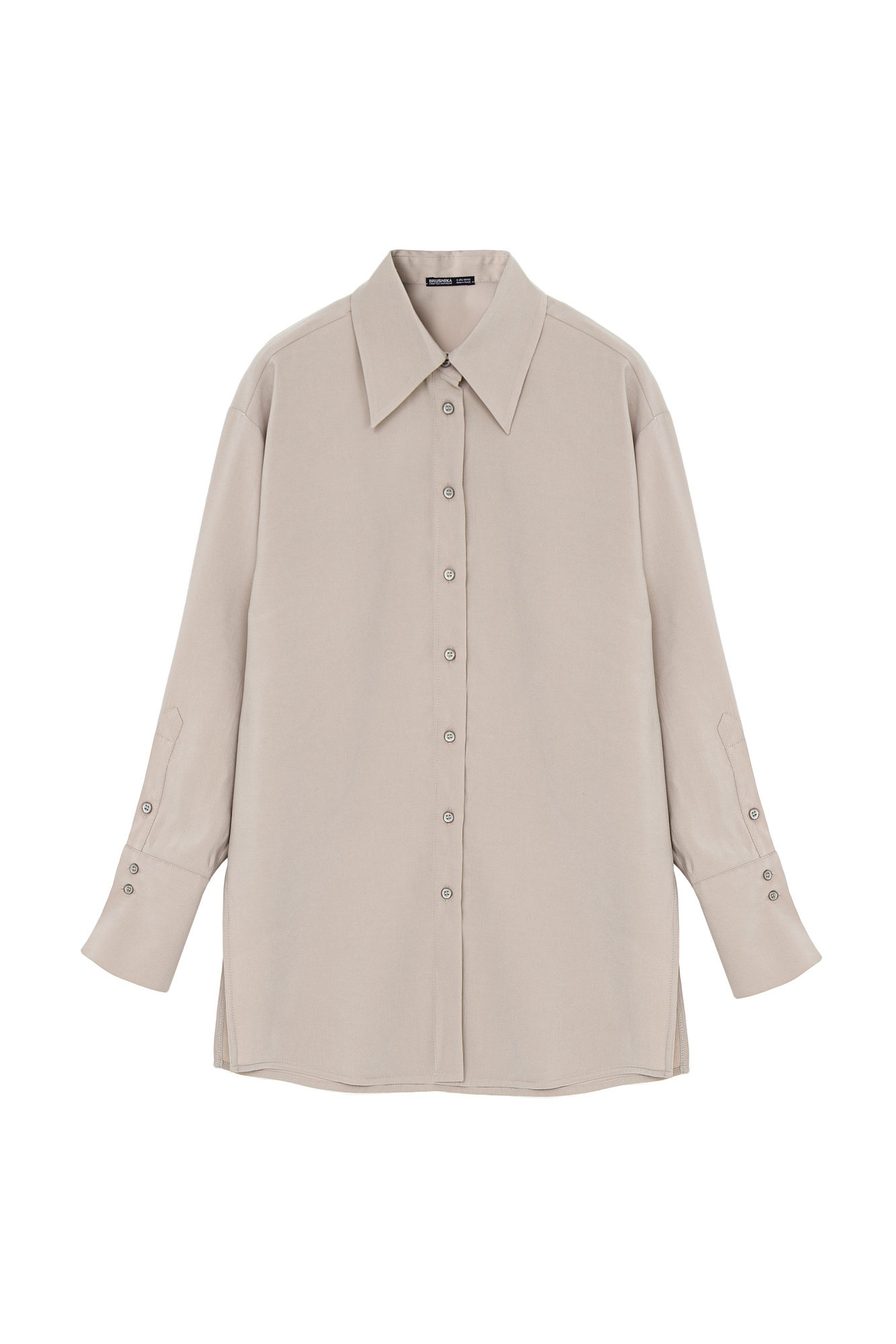 Рубашка свободного кроя из купры с добавление вискозы. Классический воротник и разрезы на манжетах. Застежка на пуговицы.