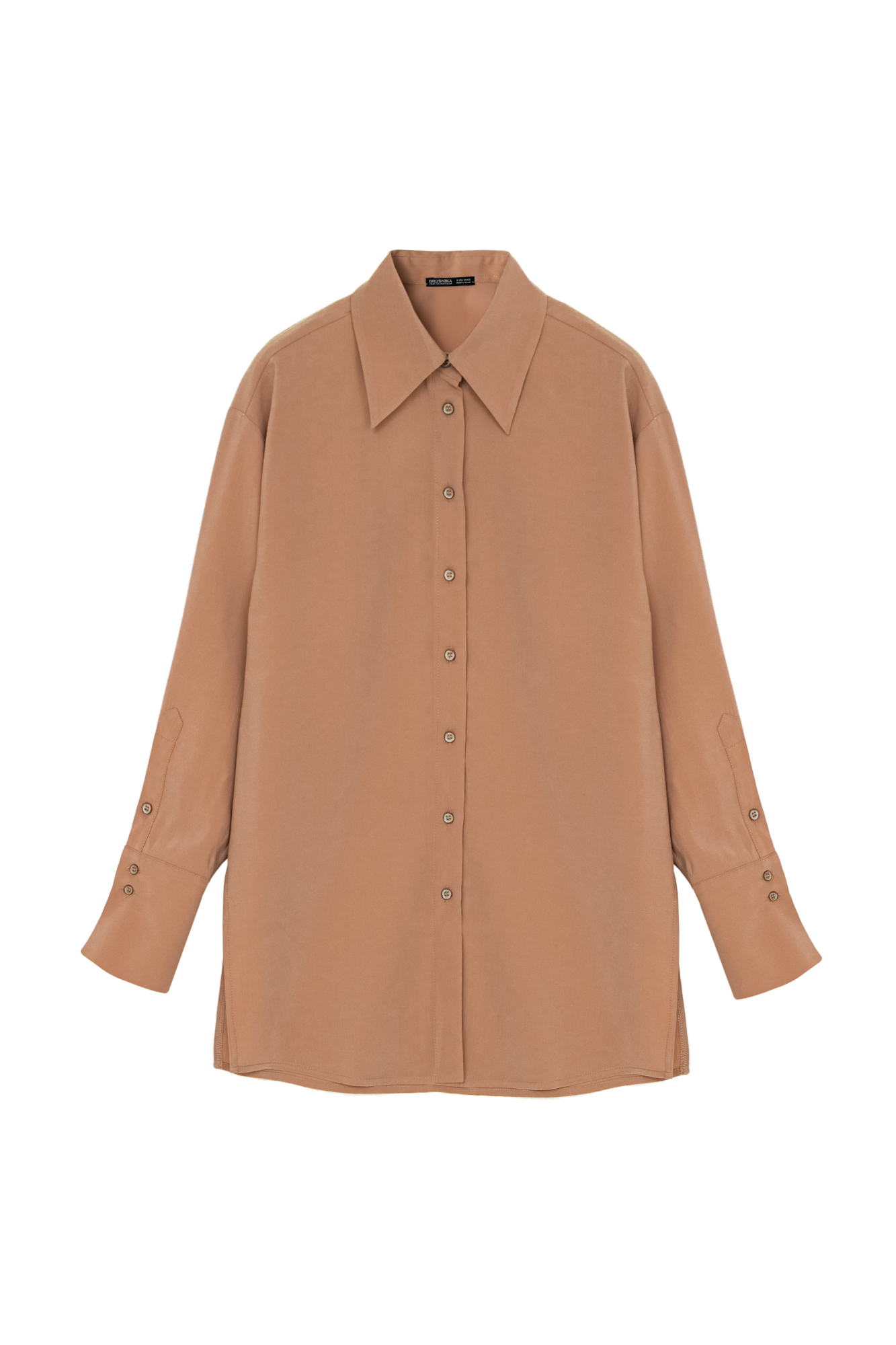 Рубашка свободного кроя из купры с добавление вискозы. Классический воротник и разрезы на манжетах. Застежка на пуговицы.