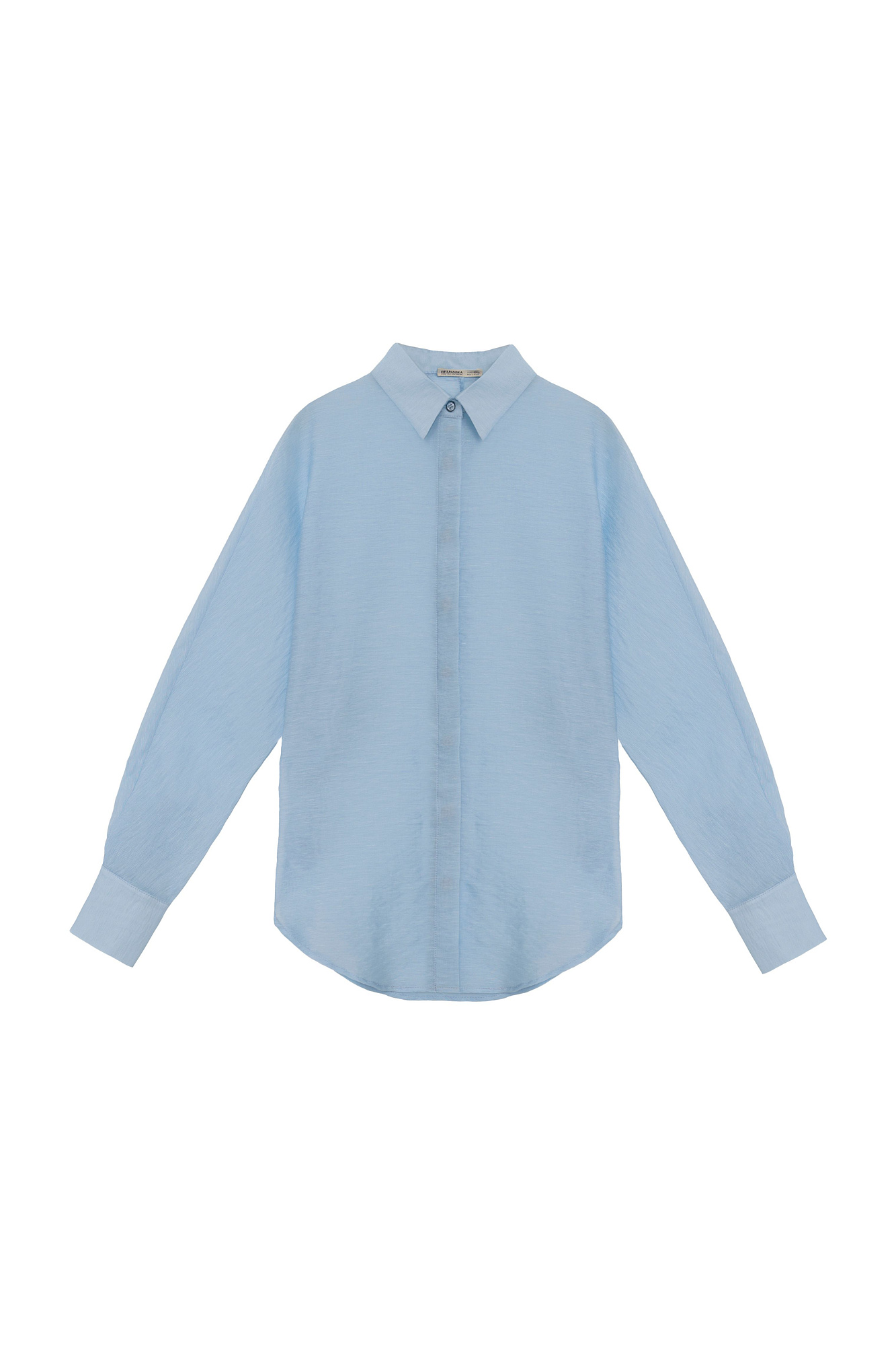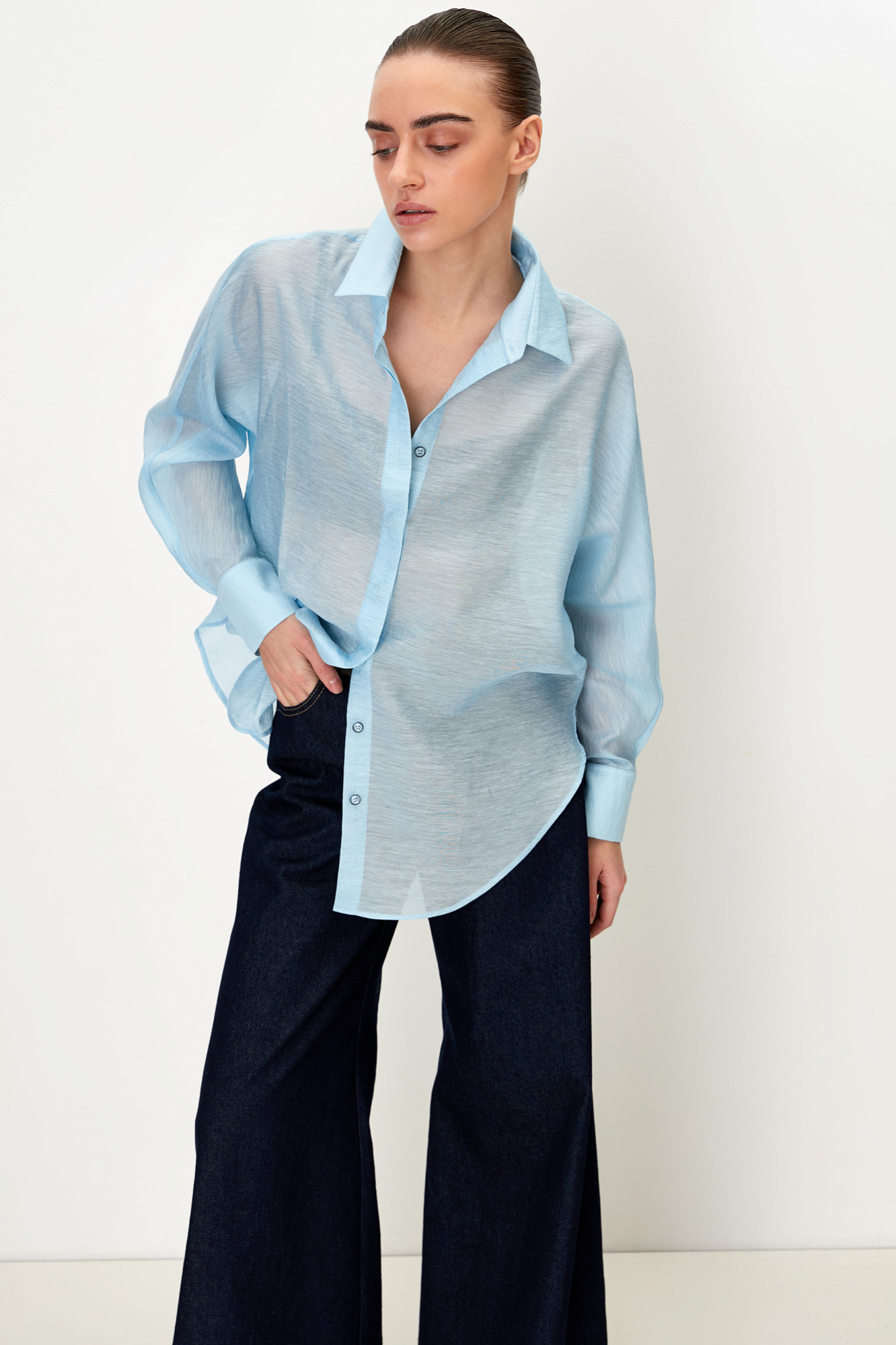 Полупрозрачная рубашка в классическом стиле из тенселя. Модель свободного кроя с застежкой на пуговицы.