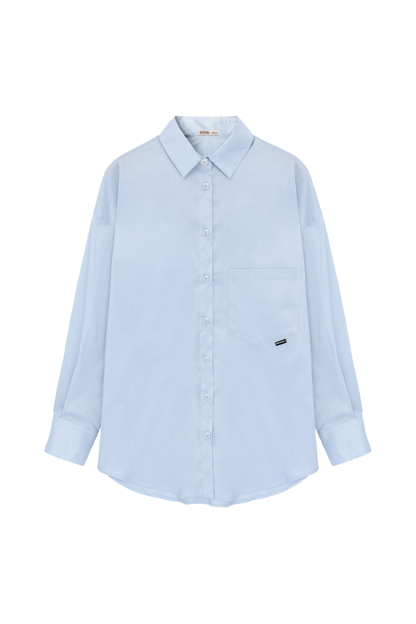 Рубашка с накладным карманом и брендированным ярлыком. Модель свободного силуэта, длинные рукава с манжетами и асимметричный нижний край.