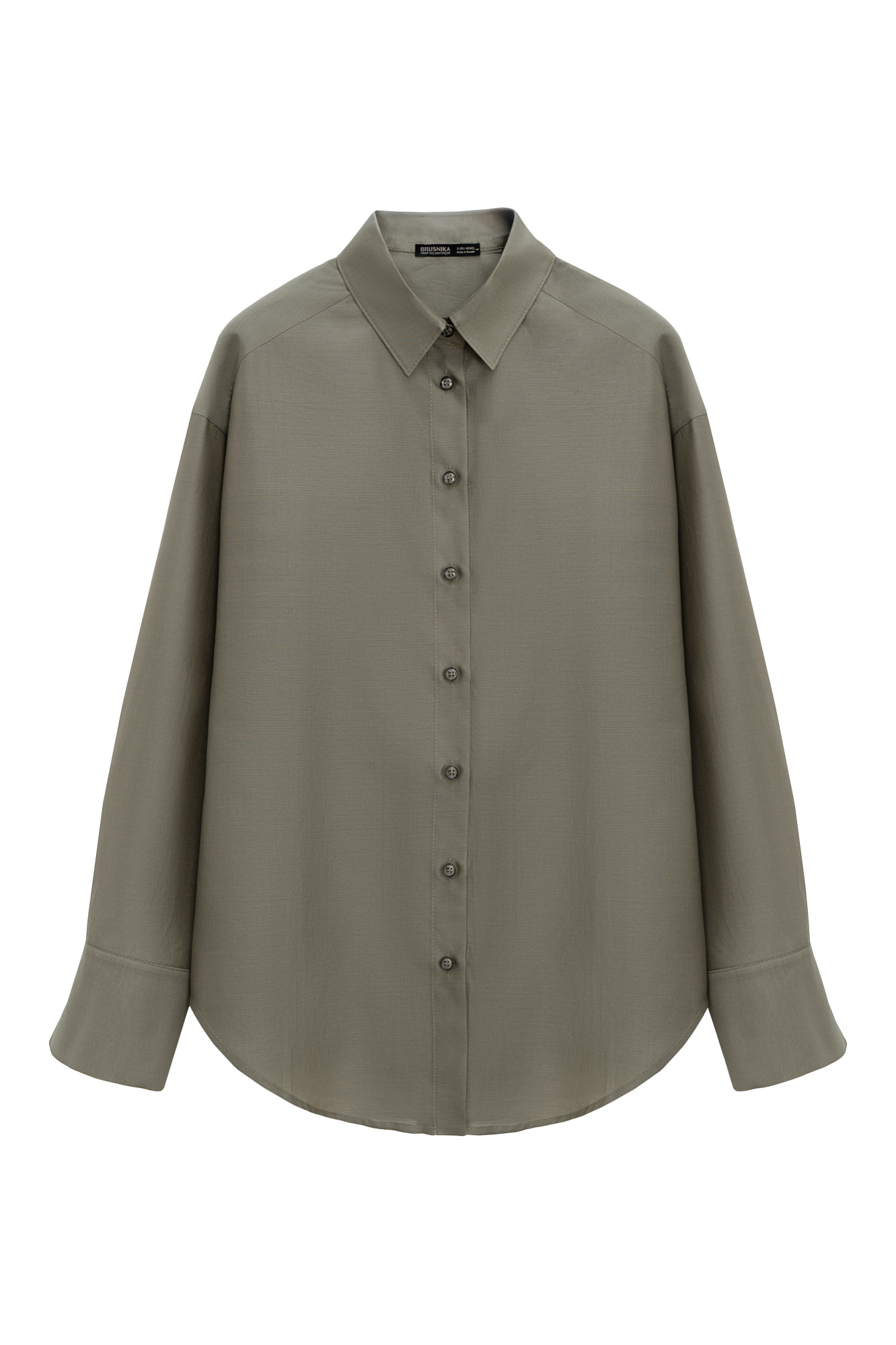 Классическая рубашка из тонкого шелка и хлопка. Модель свободного кроя, с отложным воротником, длинными рукавами с манжетами на пуговицах. Нижний край изделия выполнен полукругом. Застежка на пуговицы.