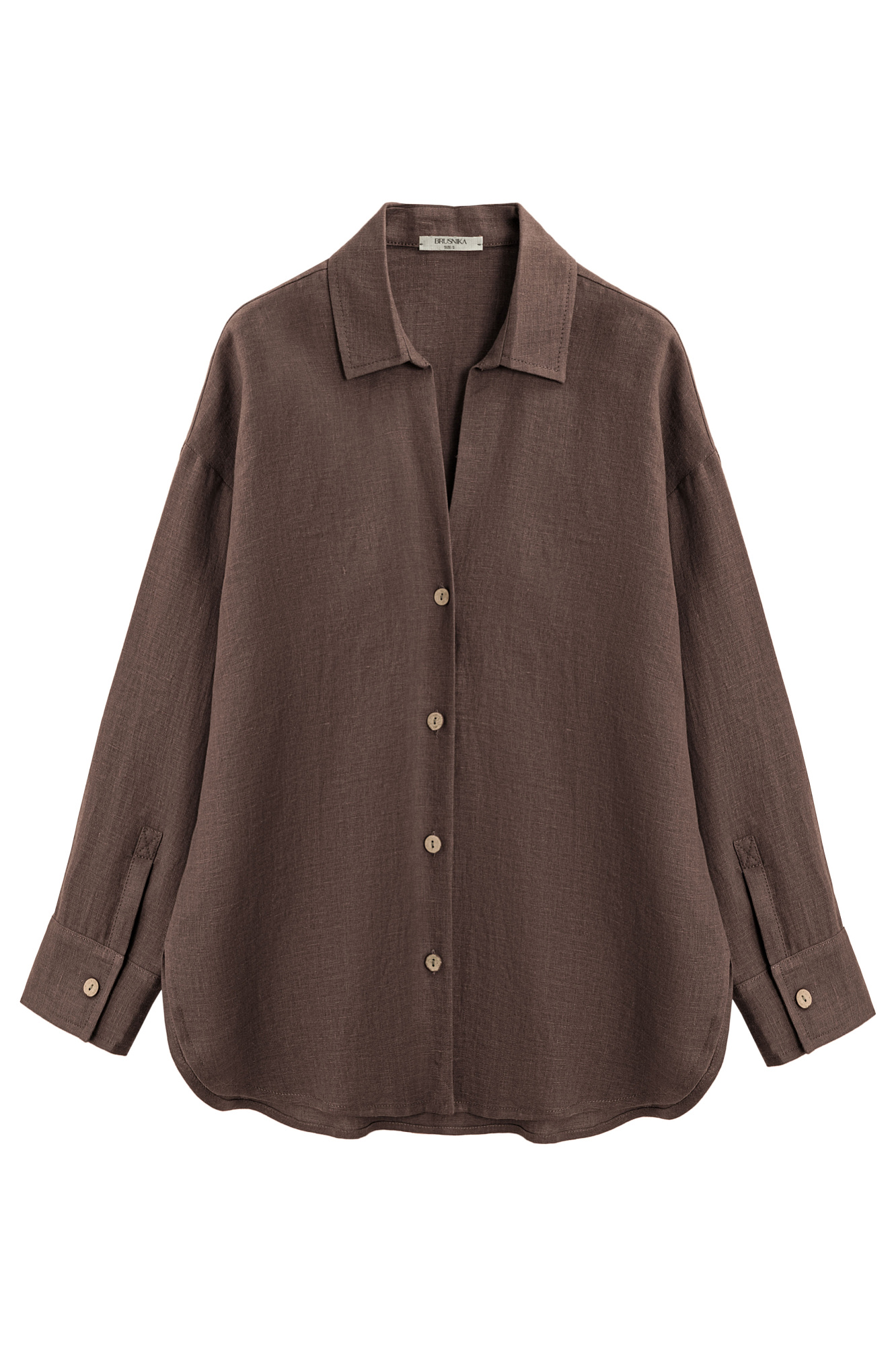 Рубашка из 100% льна. Модель свободного кроя, с отложным воротником, V-образным вырезом, длинными рукавами с манжетами на пуговицах.