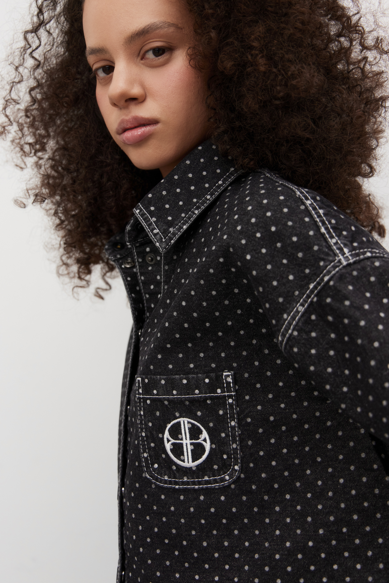 Принтованная джинсовая рубашка из 100% хлопка. Модель укороченного силуэта с удлиненной спинкой, длинными рукавами с манжетами на пуговицах, отложным воротником и нагрудным карманом с вышитым логотипом бренда. Застежка на магнитные пуговицы под планкой.