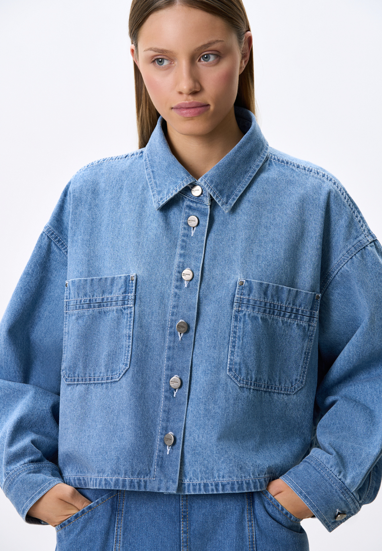 Укороченная джинсовая рубашка из 100% хлопка. Модель свободного силуэта, с отложным воротником, длинными рукавами и нагрудными карманами. Застежка на пуговицы.