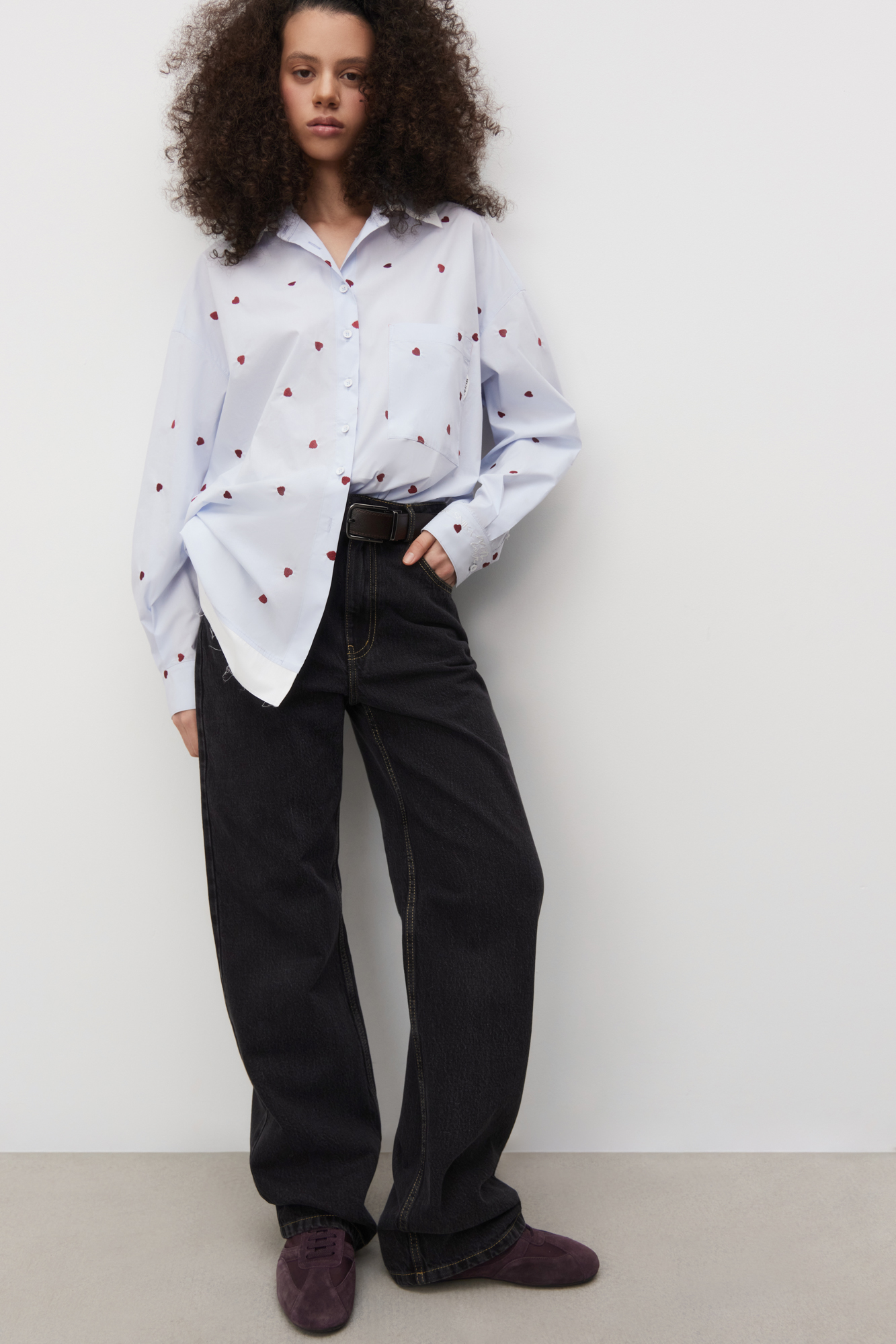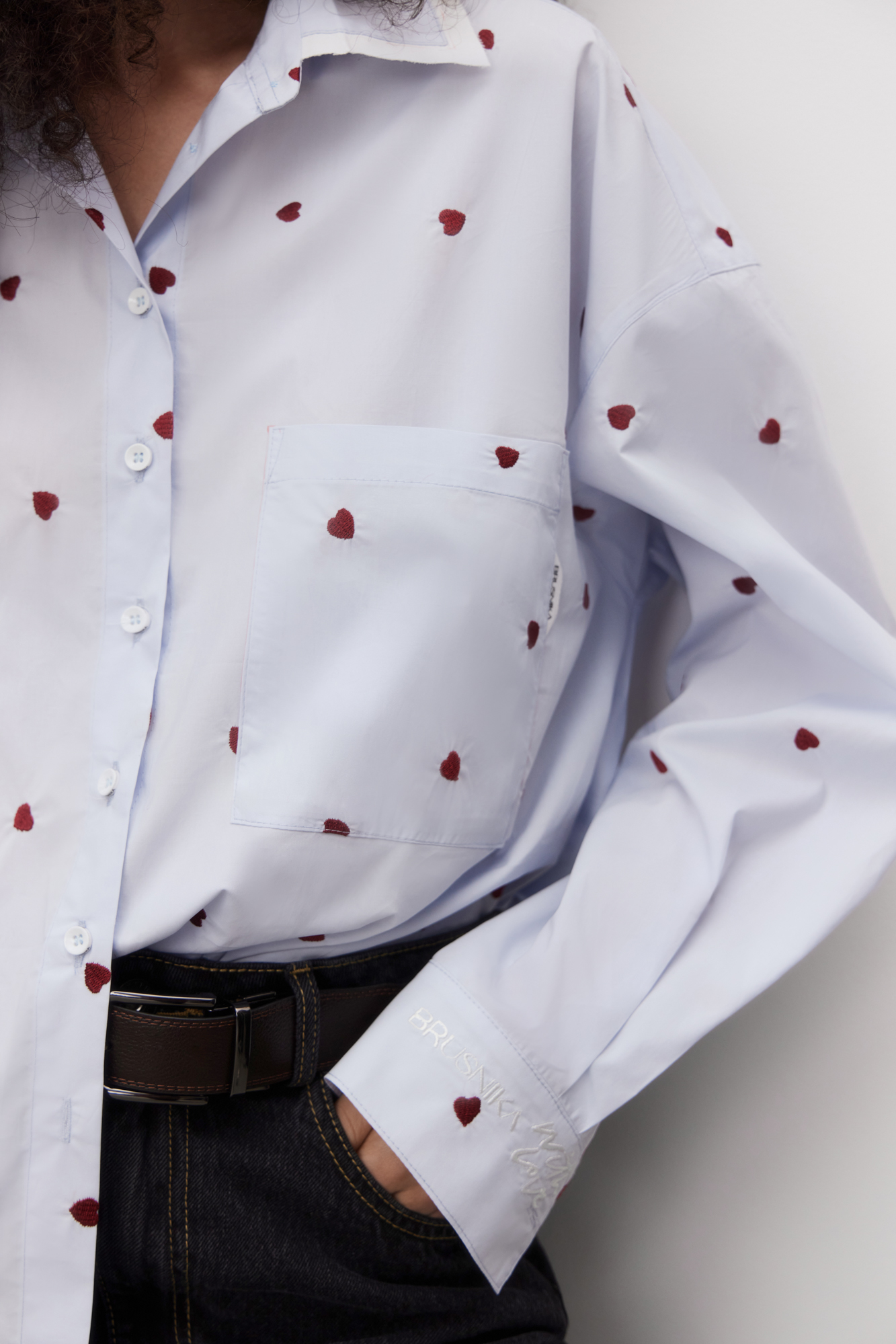 Рубашка из 100% хлопка с принтом в виде сердечек и вышивкой на манжетах. Модель с длинными рукавами с манжетами на пуговицах, отложным воротником и нагрудным карманом. Контрастные элементы в стиле гранж по низу изделия.