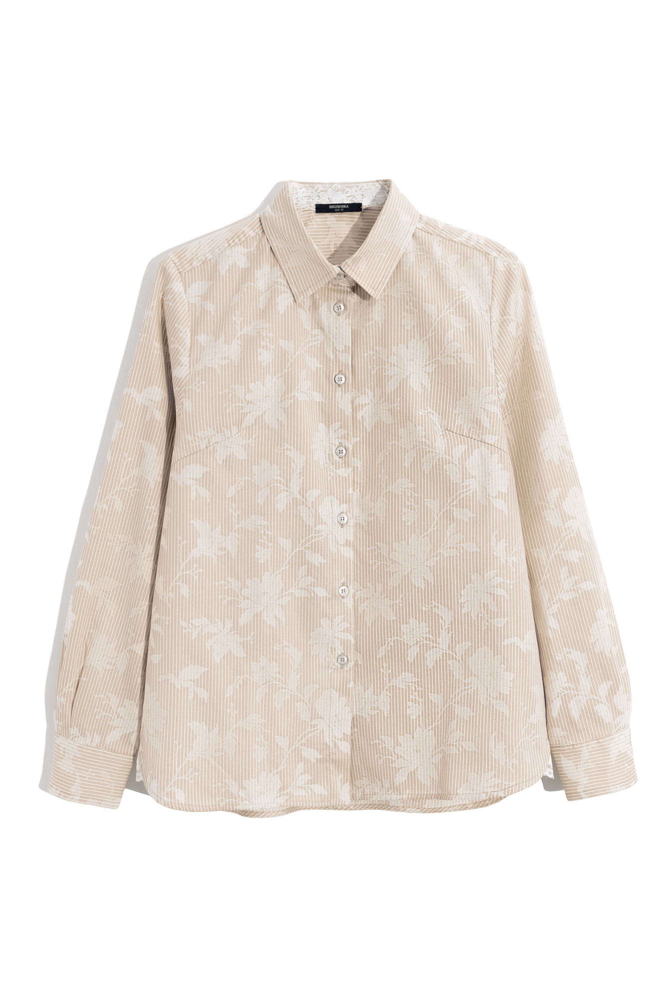 Рубашка из 100% хлопка с принтом. Модель свободного кроя с длинными рукавами, манжетами на пуговицах, классическим отложным воротником и застежкой на пуговицы. Изделие декорировано вставками из кружева.