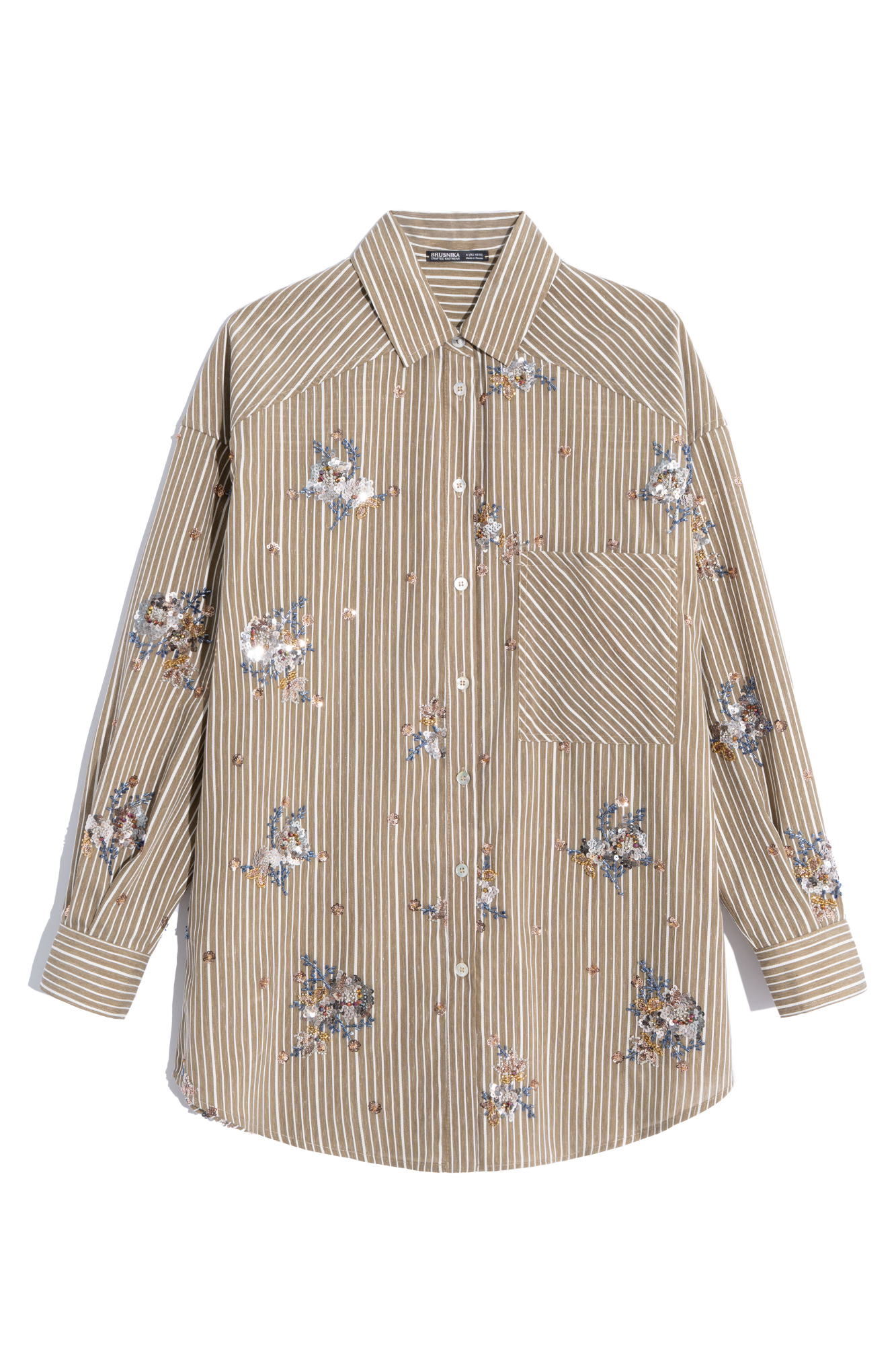 Полосатая рубашка из вискозы и льна, декорированная вышивкой из пайеток и бисера. Модель с длинными рукавами, манжетами на пуговицах, классическим отложным воротником, нагрудным карманом и застежкой на пуговицы. Дополнить образ можно брюками в том же стиле.