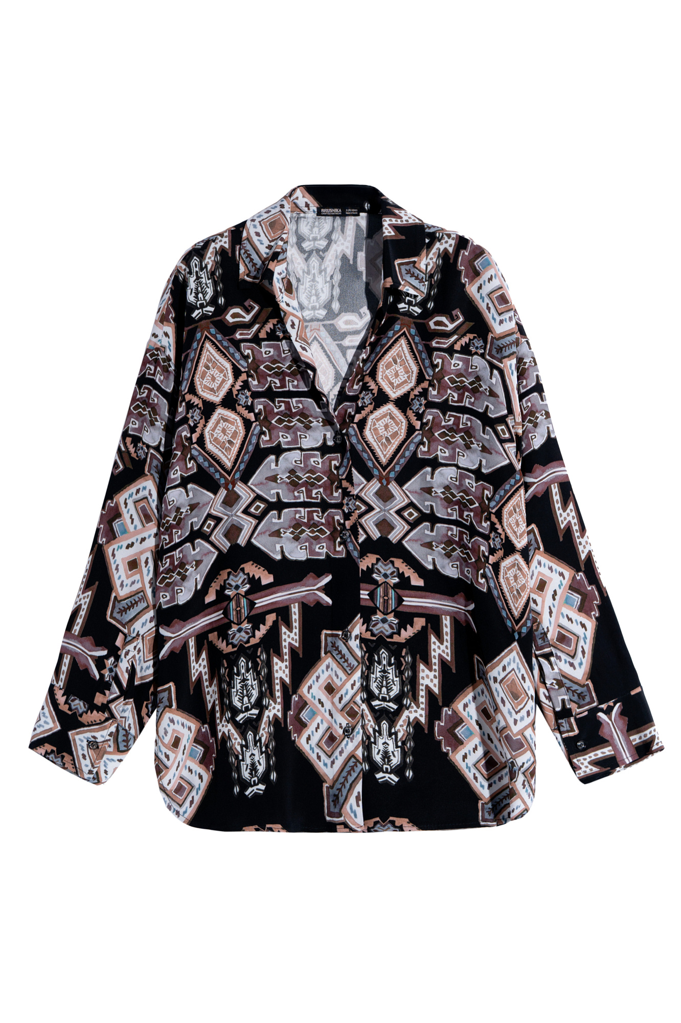 Комплет, состоящий из рубашки и брюк, выполненных из 100% вискозы. Рубашка свободного кроя, с отложным воротником, V-образным вырезом, длинными рукавами с манжетами на пуговицах. Широкие брюки свободного прямого кроя с врезными карманами по бокам, с поясом на узкой резинке, дополненным кулиской.