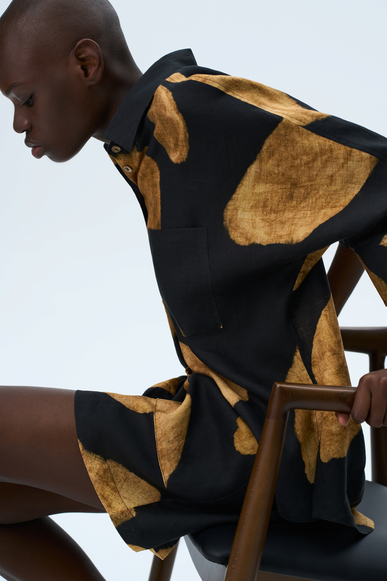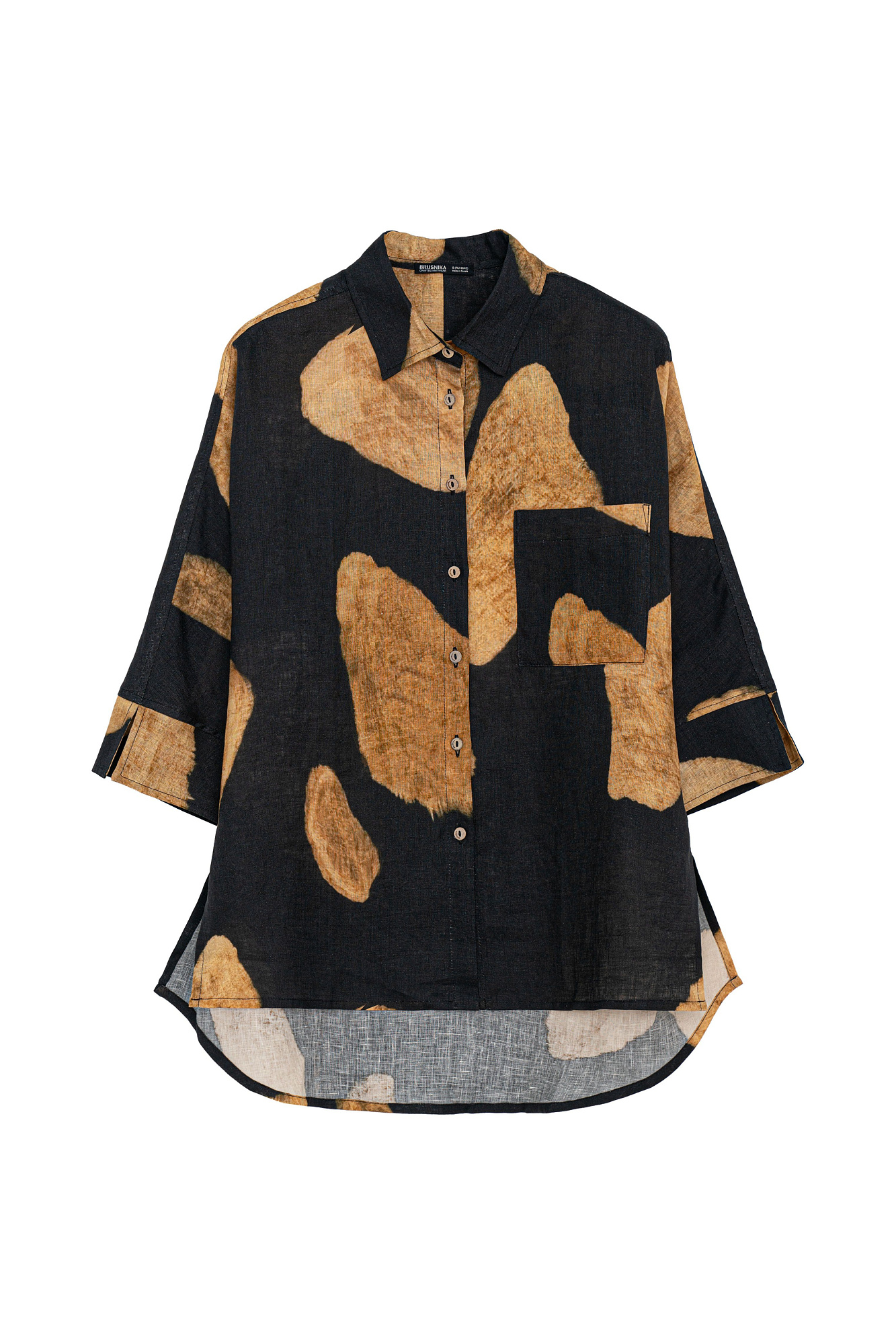 Рубашка из 100% льна с удлиненной спинкой. Модель свободного силуэта с разрезами на манжетах и по бокам. Накладной карман на груди.