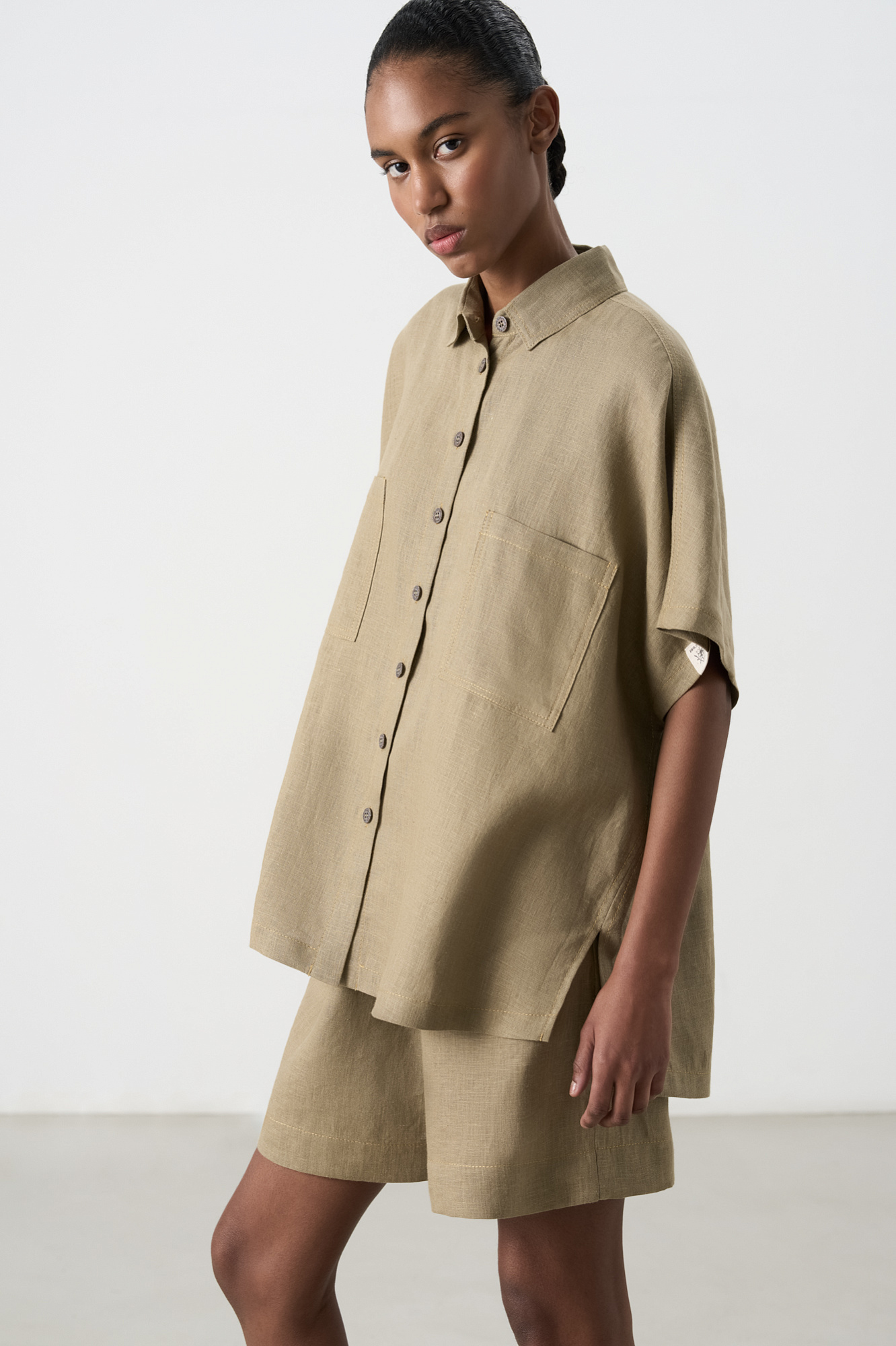 Свободная рубашка из 100% льна. Модель прямого кроя, без рукавов, с отложным воротником, двумя нагрудными карманами и застежкой на пуговицы.